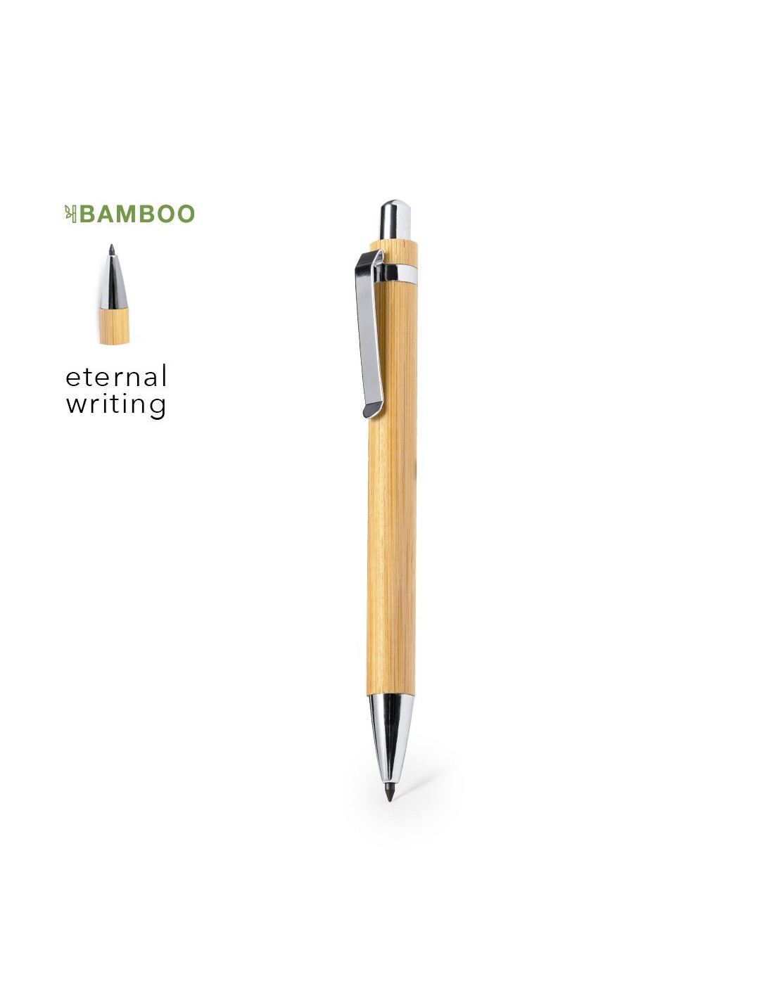 Lápiz eterno fabricado en bambú y accesorios cromados. Reutilizable y con escritura infinita, para así usar siempre el mismo lápiz y no generar residuos. Materiales como el bambú fomentan la utilización de materias primas naturales reduciendo las emisiones contaminantes. Además, el bambú proviene de una planta de gran resistencia y versatilidad, con crecimiento y regeneración rápida, siendo una excelente alternativa al uso de madera tradicional.