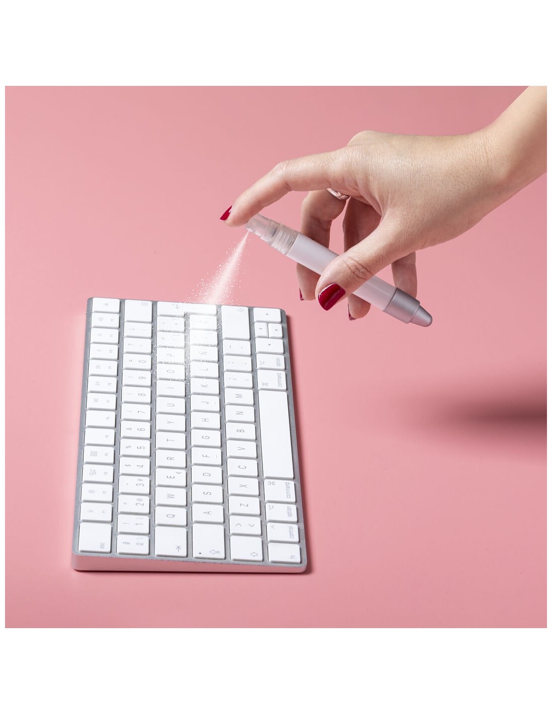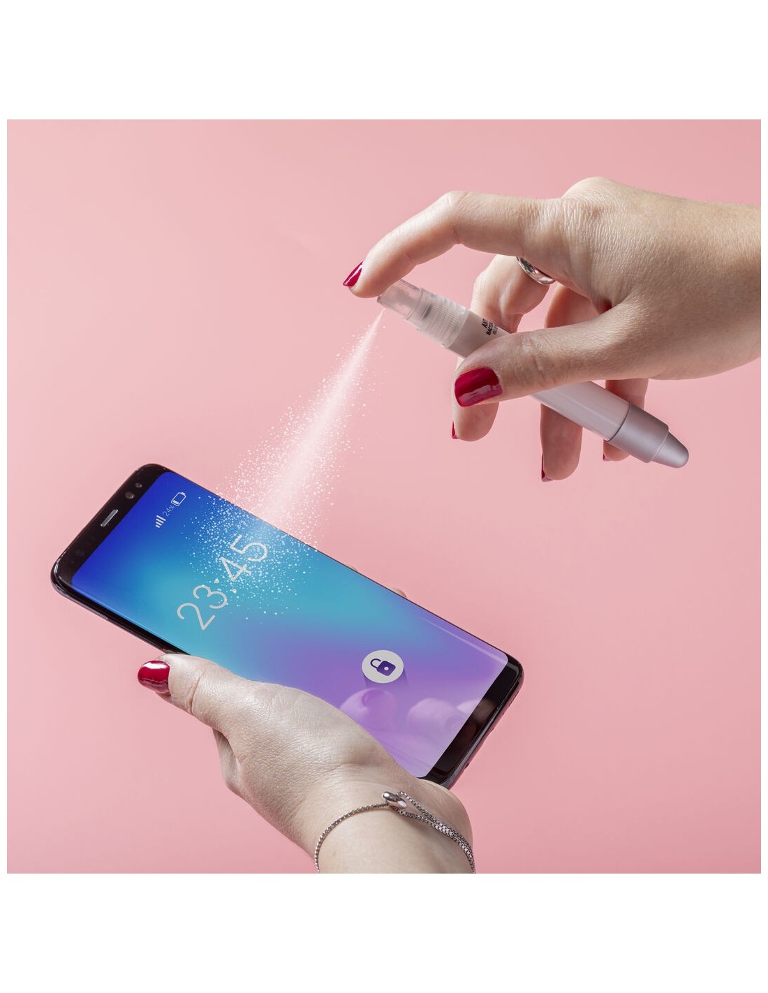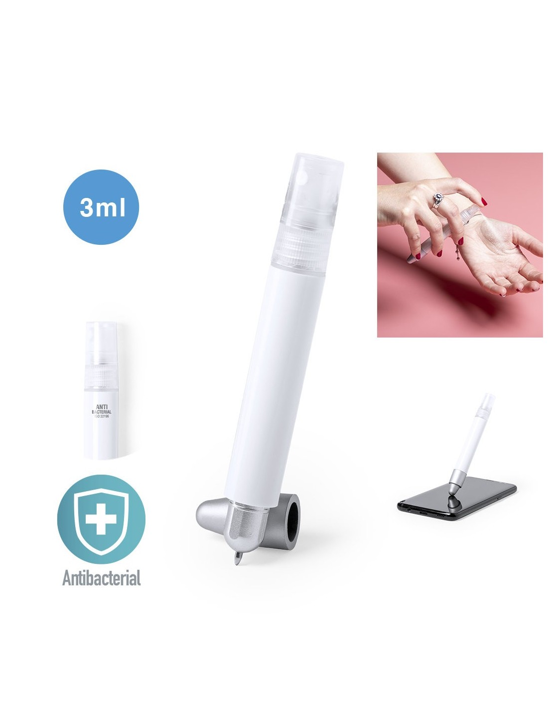 Bolígrafo antibacteriano con pulverizador recargable integrado y capucha protectora con puntero en color gris. Acabado liso en resistente ABS brillante con detalles cromados y escritura en tinta azul. Capacidad del pulverizador 3ml. Líquido no incluido. Los productos con tratamientos antibacterianos son capaces de reducir drásticamente las cargas bacterianas presentes en las superficies de los materiales, gracias a la incorporación de agentes microbianos permanentes estáticos, con alta efectividad para inhibir y prevenir la contaminación bacteriana. Artículo de acuerdo al estándar ISO 22196, que determina la actividad antibacteriana en materiales plásticos y superficies no porosas, lo que permite conocer la efectividad de inhibición microbiana que tienen los aditivos sobre los objetos tratados mediante una evaluación cuantitativa.