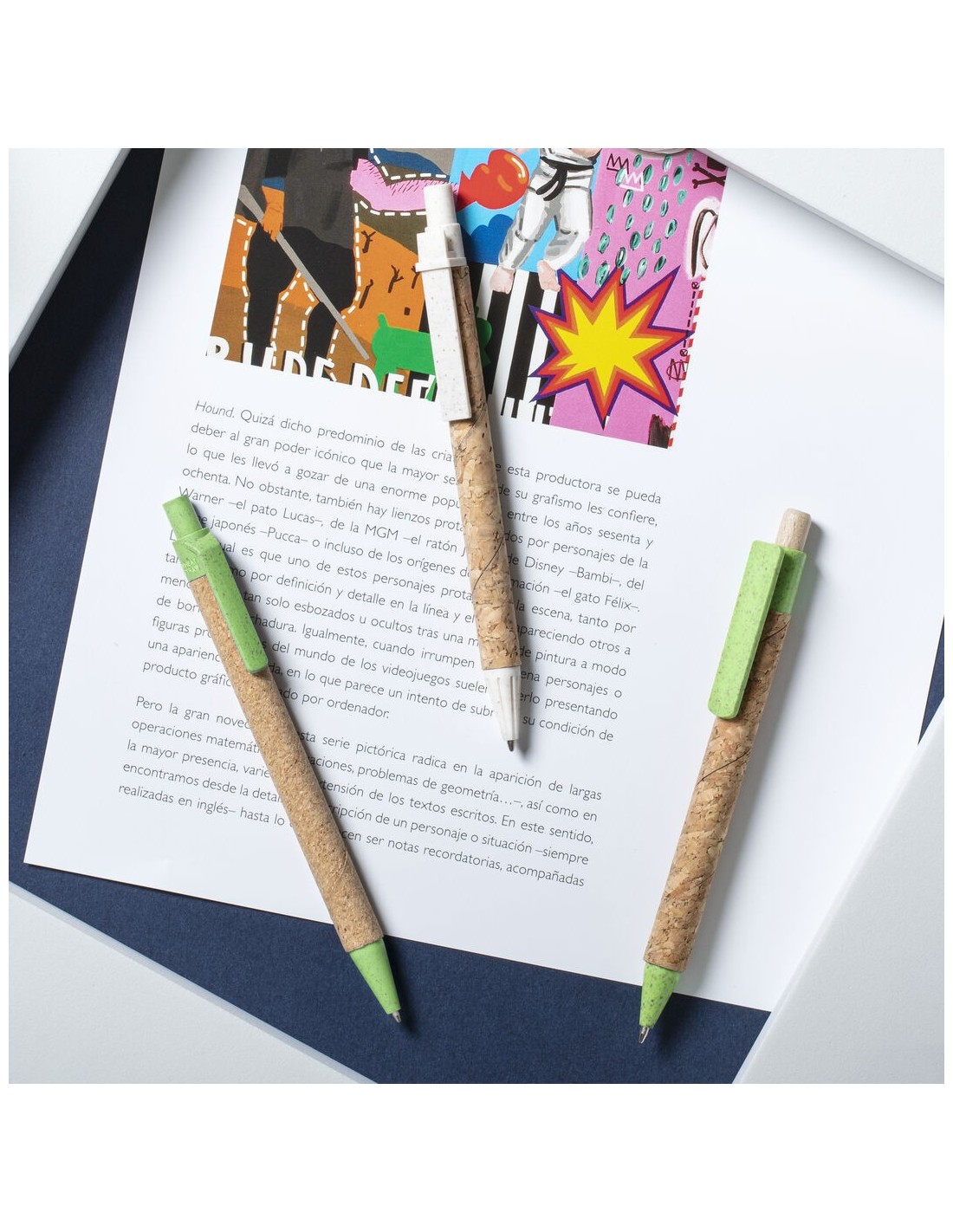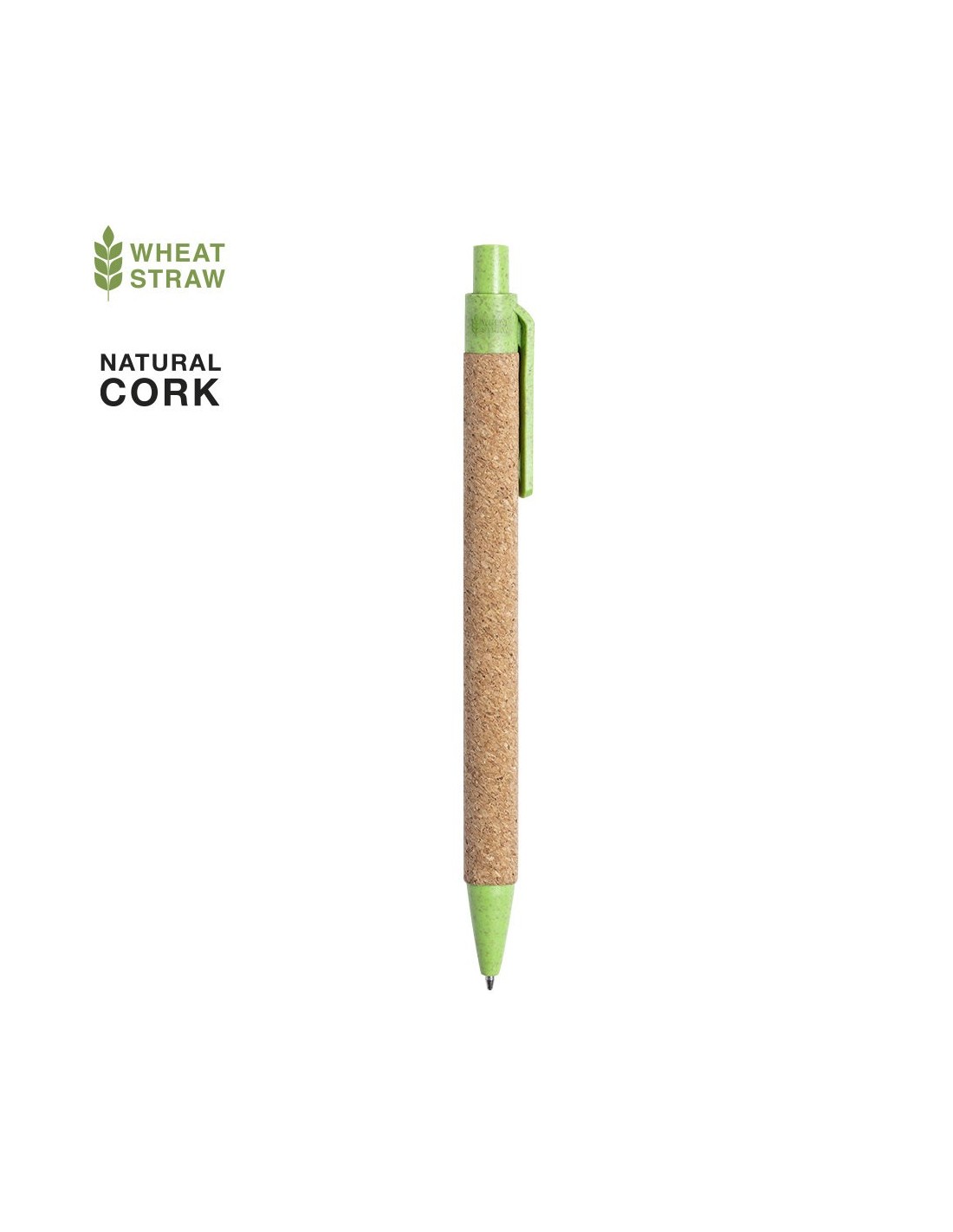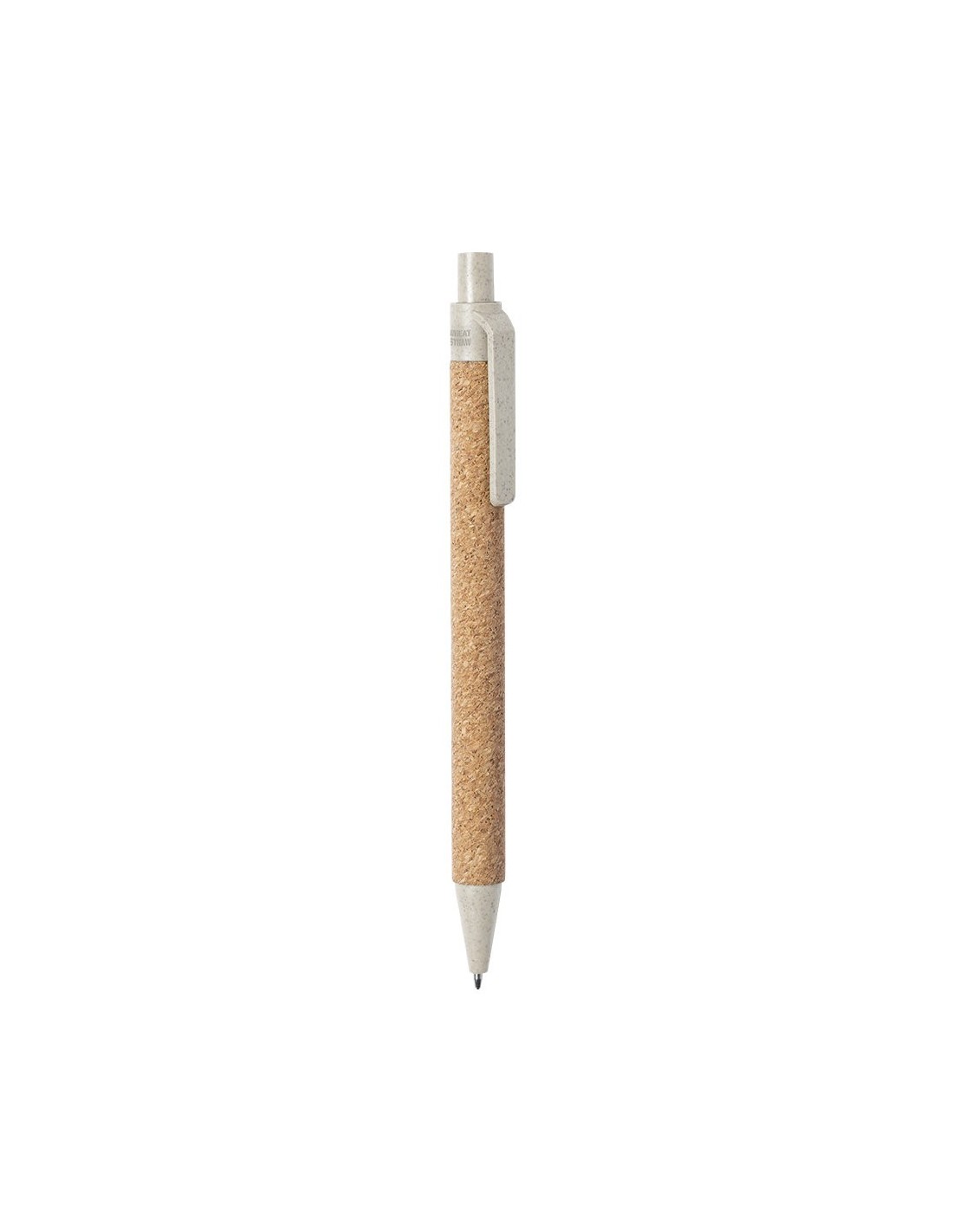 Bolígrafo de línea nature con mecanismo pulsador. Combinación de cuerpo en corcho natural y accesorios en caña de trigo y ABS , para así fomentar la utilización y reciclado de materias primas, reduciendo así las emisiones contaminantes. Disponible en variada gama de colores, con tinta azul. Distintivo Wheat Straw en la parte superior del bolígrafo.