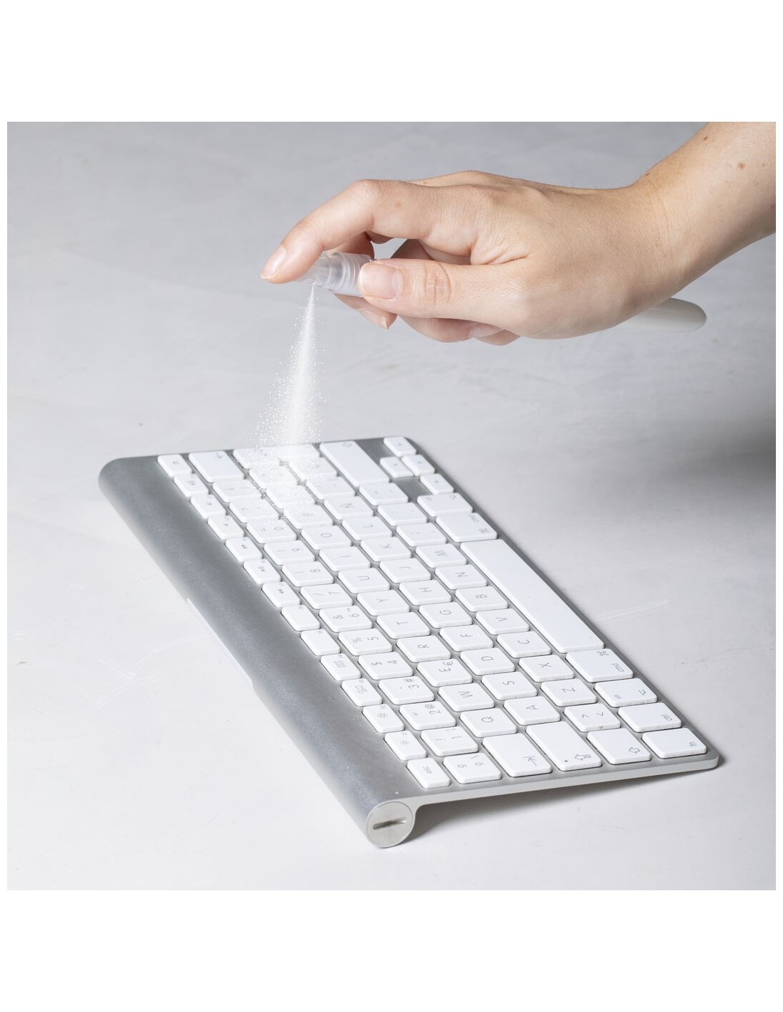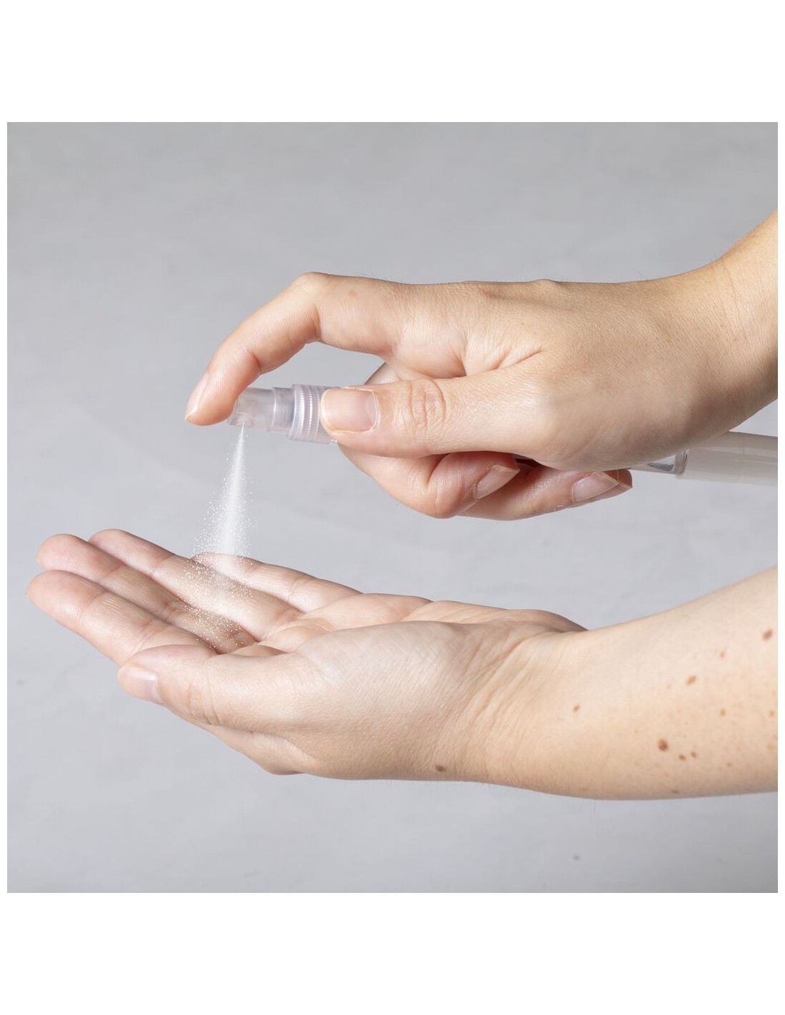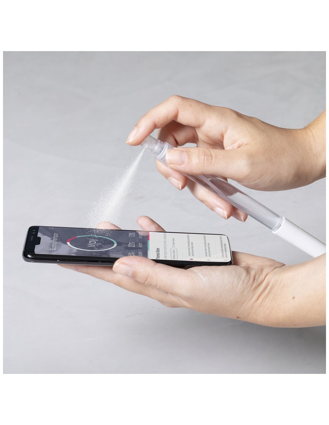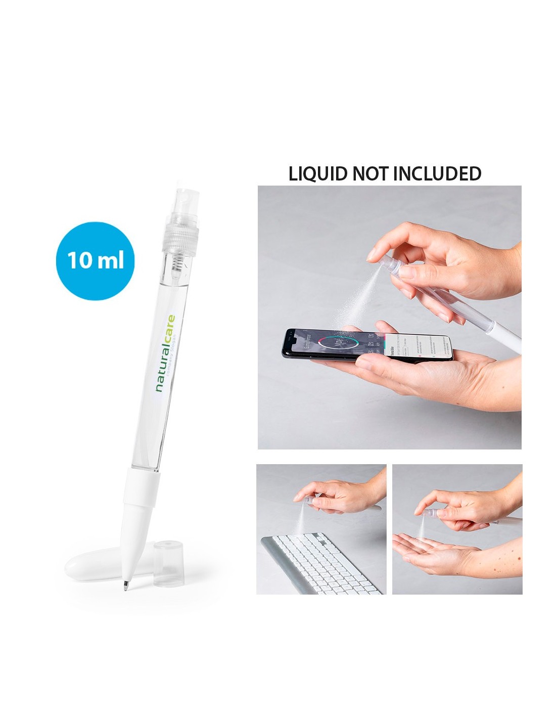 Bolígrafo higiénizante con pulverizador recargable integrado y capucha protectora. Acabado en resistente ABS brillante y escritura en tinta azul. Capacidad del pulverizador 10ml. Líquido no incluido. Disponible en color blanco.