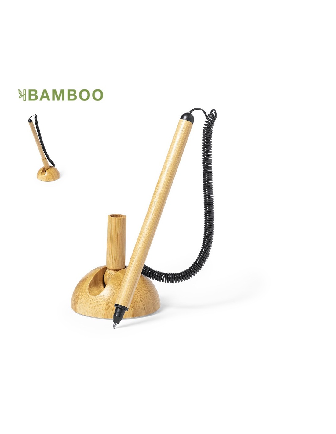 Bolígrafo de línea nature fabricado en bambú, en tinta azul y con cable extensible. Incluye soporte de bambú para el bolígrafo, con adhesivo 3M en la base, fijación extra fuerte y libre de residuos al despegarlo. Presentado en caja individual de diseño kraft.