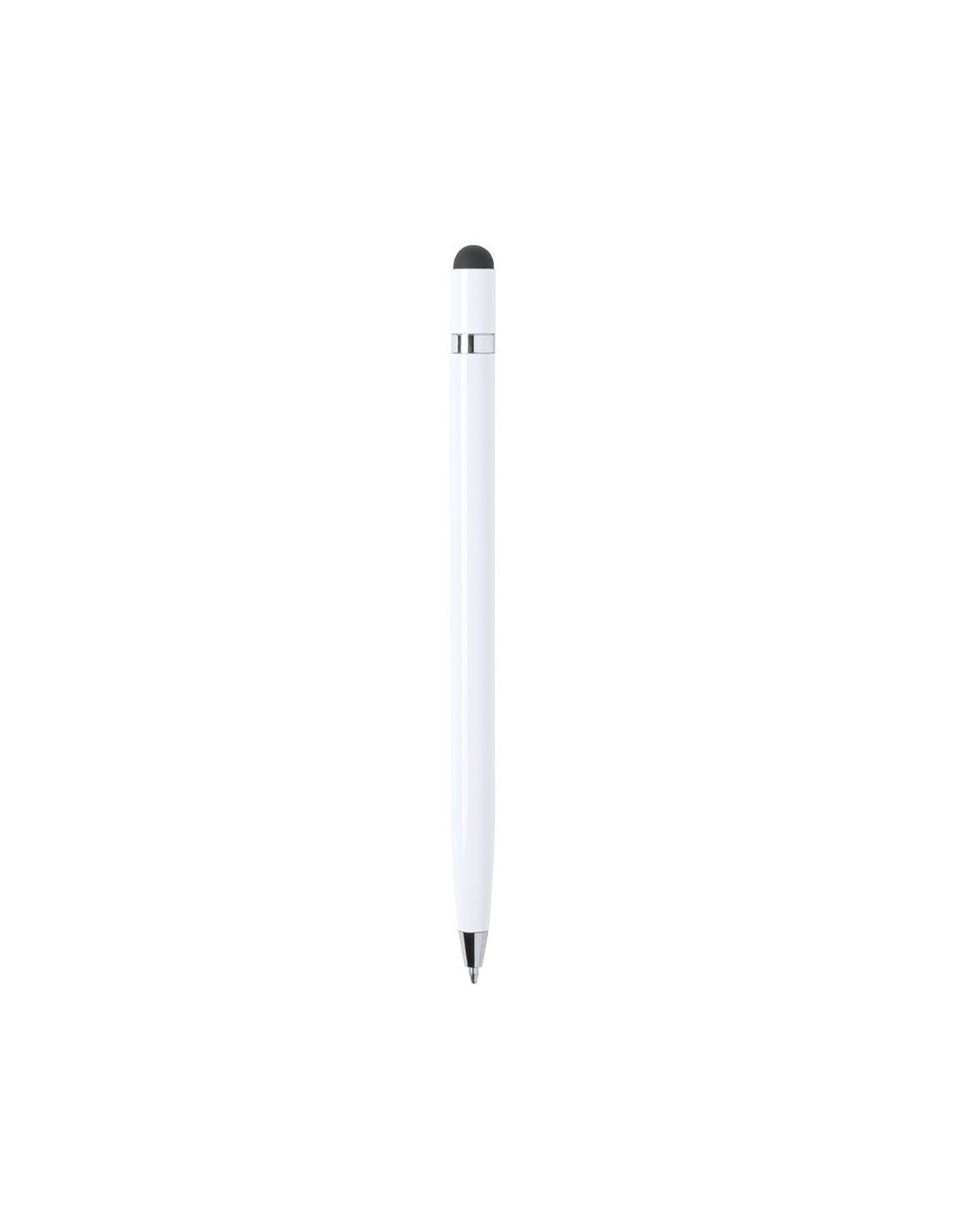 Bolígrafo puntero de mecanismo giratorio con cuerpo en aluminio de suave acabado metalizado. Con anilla cromada. Colores dorado, rosa, plateado y grafito con acabado brillo y color blanco con acabado mate. Tinta azul.
