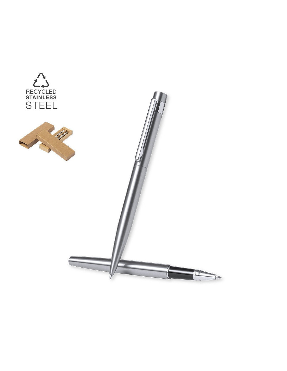 Set eco-friendly de bolígrafo y roller, fabricados en acero inox reciclado. Incluye: Bolígrafo de mecanismo giratorio, con cuerpo en acabado plateado y accesorios en cromado. Clip metálico y distintivo acero inox reciclado en la parte superior del bolígrafo. Cartucho jumbo y tinta azul. Roller con cuerpo en color plateado y accesorios en cromado. Clip metálico y distintivo acero inox reciclado en la parte superior de la capucha. Cartucho jumbo y tinta azul. Set presentado en estuche individual de diseño kraft con funda a juego. El acero es uno de los materiales más demandados y que puede encontrarse casi en todas partes, desde productos de uso diario a grandes construcciones. Con innumerables propiedades, entre las que cabe destacar la durabilidad y su alto grado de reutilización, convirtiéndolo en una alternativa muy valorada en soluciones de sostenibilidad. Debidamente tratado, permite obtener nuevos recursos de infinita utilización.