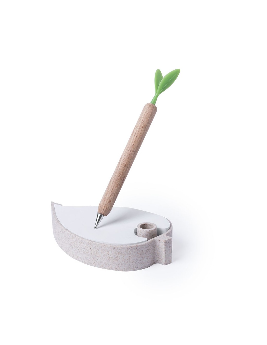 Portanotas de línea nature con cuerpo en caña de trigo, para así fomentar la utilización de materias primas naturales y reducir las emisiones contaminantes. Incluye bolígrafo eco con cuerpo en madera y original terminación en forma de hoja, con tinta azul. 125 notas incluidas en forma de hoja. Presentado en caja individual de cartón reciclado.