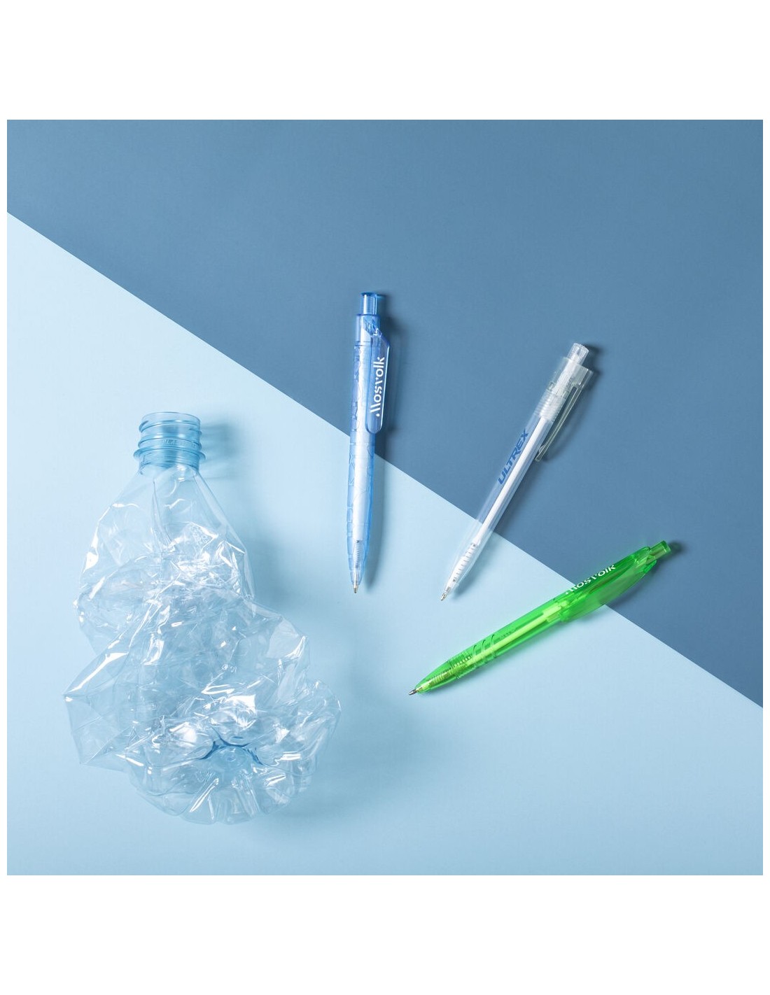 Bolígrafo de línea nature en material RPET, elaborado a partir de plástico reciclado para así fomentar la reutilización de residuos plásticos y ayudar a la sostenibilidad del planeta. De acabo translúcido, con distintivo RPET en el cuerpo del bolígrafo y disponible en variada gama de colores. Clip especialmente diseñado para marcaje en tampografía, de mecanismo pulsador y con tinta azul.
