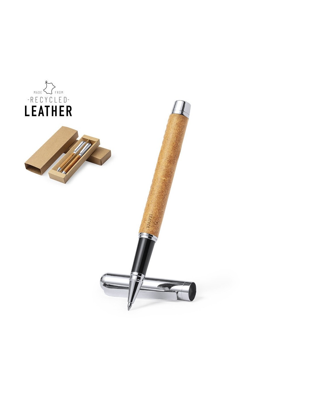 Set de bolígrafo y roller metálicos, con cuerpo recubierto en cuero reciclado. Incluye: Bolígrafo fabricado en metal cromado y con cuerpo recubierto en cuero reciclado. Elegante clip metálico y accesorios a juego. De mecanismo giratorio y en tinta azul, con distintivo cuero reciclado en cuerpo. Roller fabricado en metal cromado y con cuerpo recubierto en cuero reciclado. Elegante clip metálico y accesorios a juego. Con capucha y en tinta azul, con distintivo cuero reciclado en cuerpo. Set presentado en estuche individual de diseño kraft con funda a juego. El cuero reciclado rescata las fibras desechadas en los procesos de fabricación del cuero, minimizando el desperdicio de material, contribuyendo a reducir el impacto ambiental y manteniendo a la vez sus propiedades originales.
