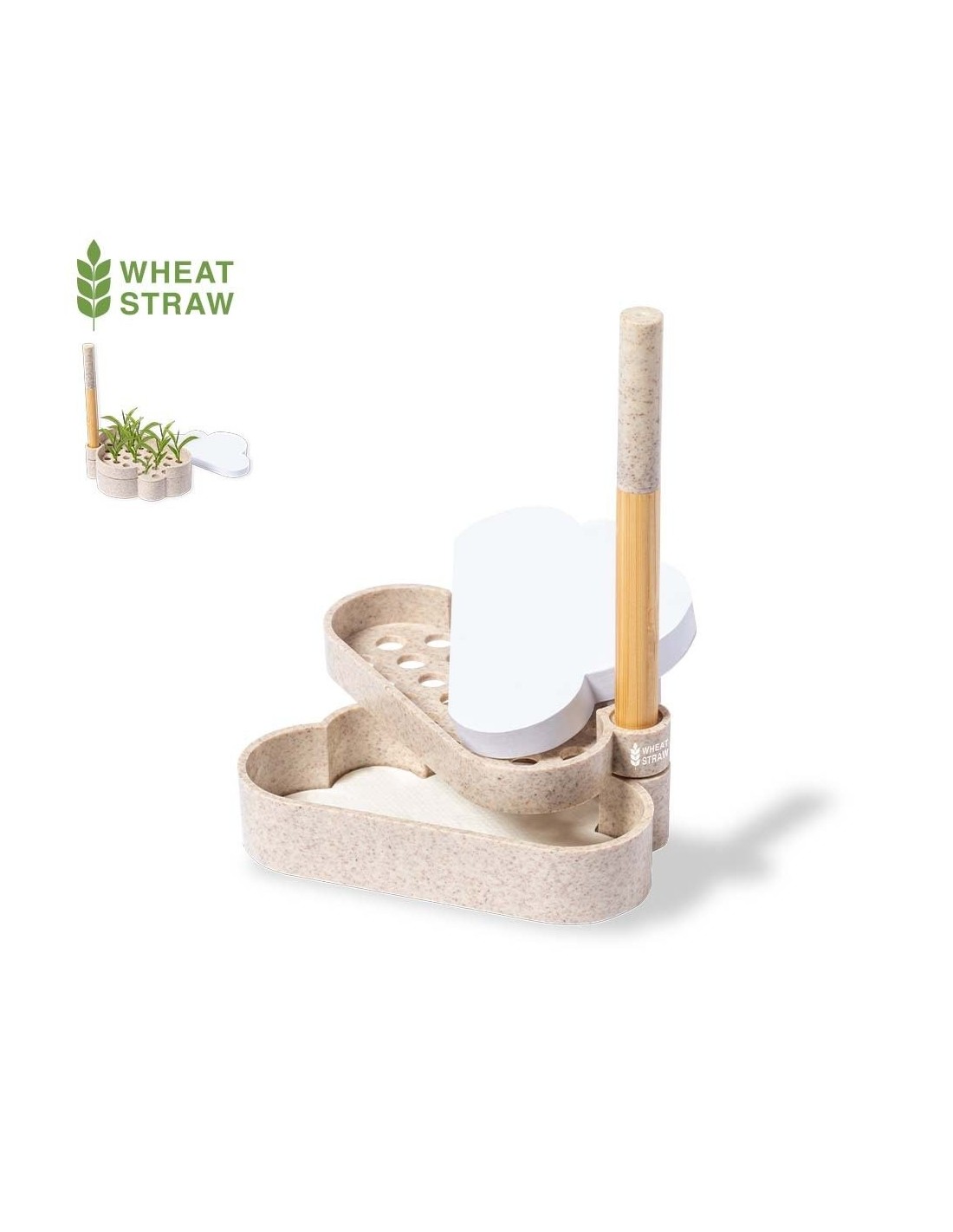 Portanotas semillas de línea nature con original diseño nube. Incluye: Bloc de 80 notas blancas en forma de nube. Base con soporte para bolígrafo y dos compartimentos, con hoja de papel semilla incluida. Fabricado en caña de trigo, para así fomentar la utilización de materias primas naturales y reducir las emisiones contaminantes. Bolígrafo puntero con cuerpo fabricado en bambú; capucha y detalles en caña de trigo. En tinta azul. Set presentado en caja individual de diseño kraft, con manual de instrucciones en español e inglés.