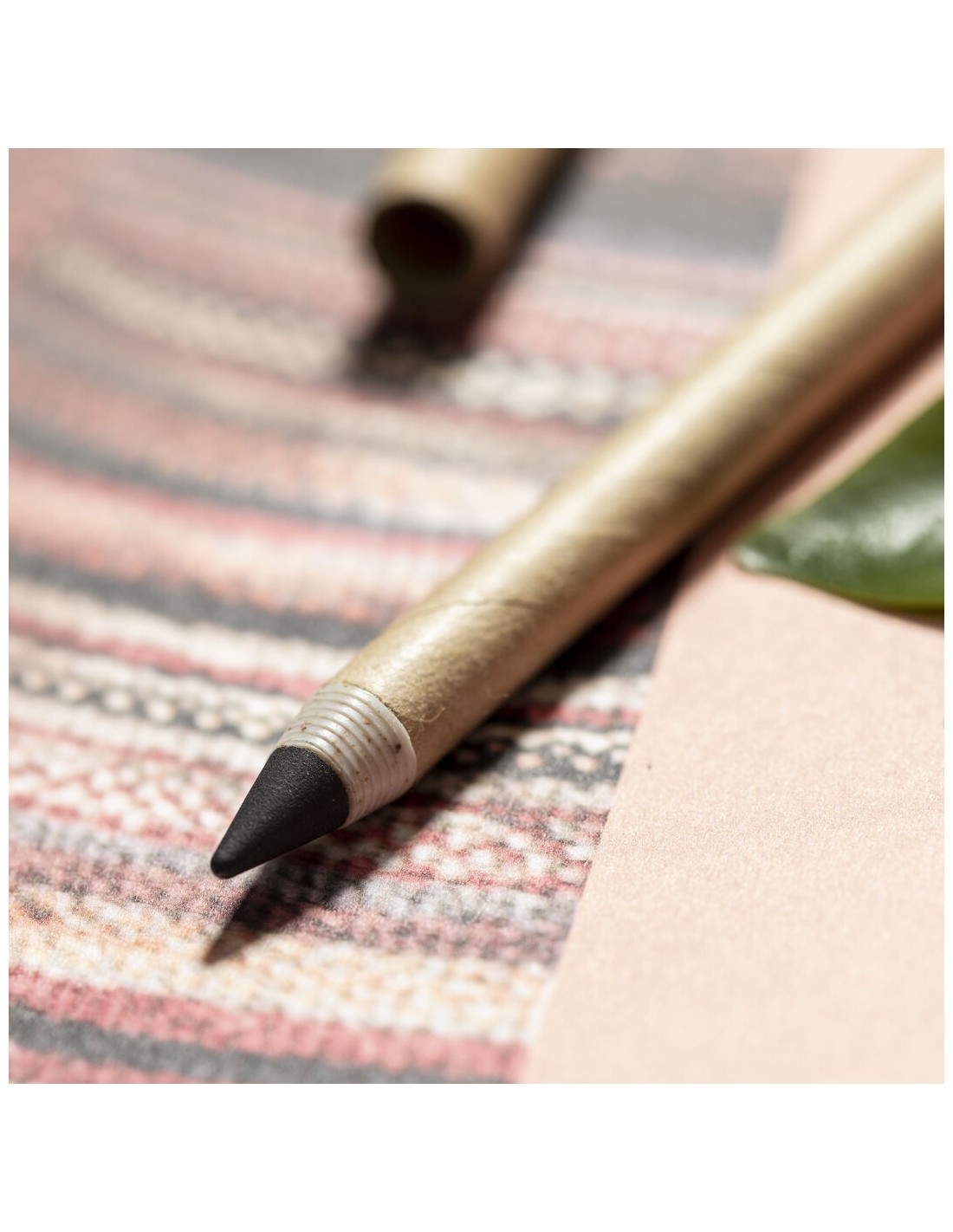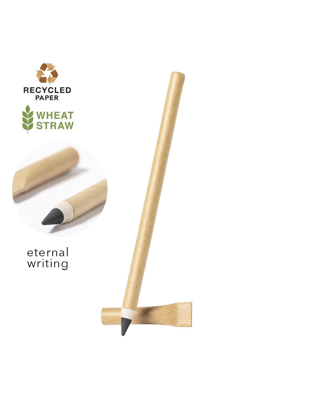 Lápiz eterno de línea nature con capucha. Fabricado en papel reciclado y con punta en caña de trigo, fomentando la utilización de materias primas naturales y reducir las emisiones contaminantes. Reutilizable y con escritura infinita, para así usar siempre el mismo lápiz y no generar residuos.