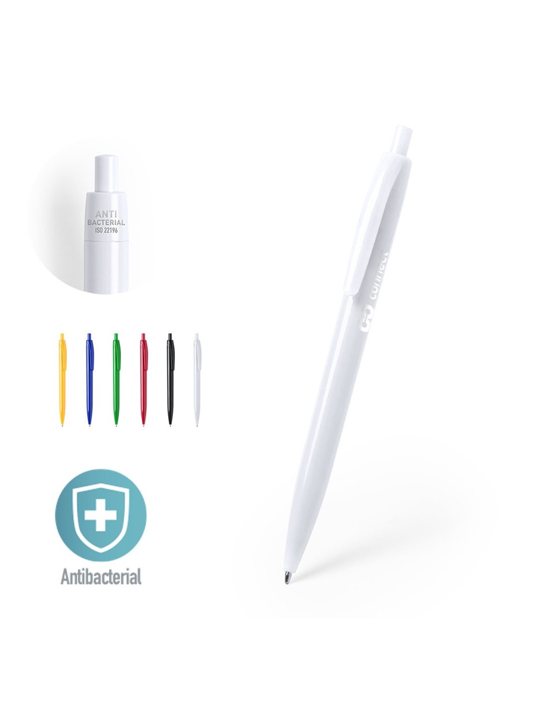 Bolígrafo antibacteriano de mecanismo pulsador. Diseño monocromático, en variada gama de colores con acabado brillante, especialmente diseñado para marcaje en tampografía. Tinta azul. Los productos con tratamientos antibacterianos son capaces de reducir drásticamente las cargas bacterianas presentes en las superficies de los materiales, gracias a la incorporación de agentes microbianos permanentes estáticos, con alta efectividad para inhibir y prevenir la contaminación bacteriana. Artículo de acuerdo al estándar ISO 22196, que determina la actividad antibacteriana en materiales plásticos y superficies no porosas, lo que permite conocer la efectividad de inhibición microbiana que tienen los aditivos sobre los objetos tratados mediante una evaluación cuantitativa.