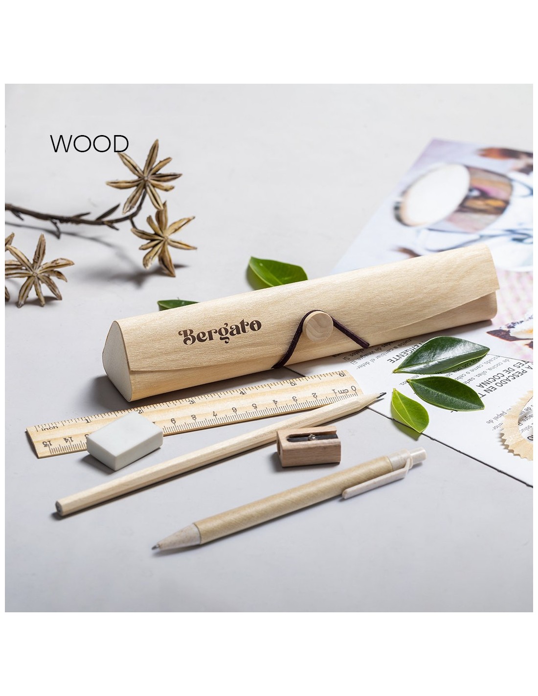 Estuche de línea nature fabricado en madera, con cinta elástica de cierre. 5 accesorios incluidos: 1 x bolígrafo de mecanismo pulsador en cartón reciclado, con accesorios en caña de trigo y tinta azul. Distintivo caña de trigo en la parte superior del bolígrafo. 1 x lápiz de madera de 177 mm de largo x 7mm de diámetro (punta sin afilar) 1 x regla de madera de 15 cm / 6 pulgadas 1 x sacapuntas de madera 1 x goma blanca