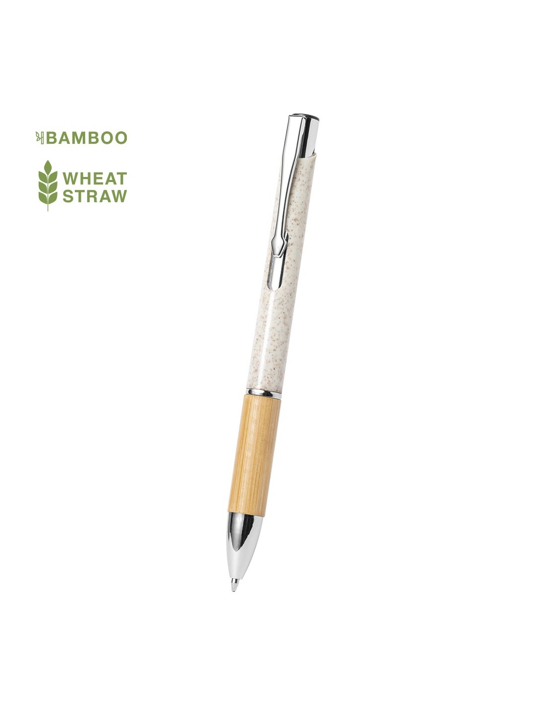 Bolígrafo de línea nature con cuerpo en combinación de caña de trigo y bambú, para así fomentar la utilización de materias primas naturales y reducir las emisiones contaminantes. Clip metálico y accesorios en cromado. De mecanismo pulsador, con cartucho jumbo y tinta azul. Disponible en variada gama de colores nature. Con distintivo Wheat Straw en la parte superior del bolígrafo.
