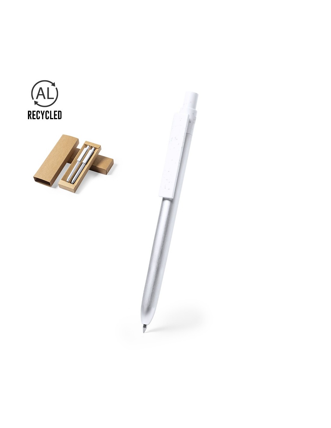 Set eco-friendly de bolígrafo y roller, fabricados en aluminio reciclado y con detalles en ABS reciclado (RABS). Incluye: Bolígrafo en aluminio reciclado de mecanismo pulsador, con cuerpo en color plateado y accesorios en blanco. Con distintivo aluminio reciclado en la parte superior del bolígrafo, cartucho jumbo y tinta azul. Roller en aluminio reciclado de mecanismo pulsador, con cuerpo en color plateado y accesorios en blanco. Con distintivo aluminio reciclado en la parte superior del roller, cartucho jumbo y tinta azul. Set presentado en estuche individual de diseño kraft con funda a juego. El origen del aluminio reciclado se encuentra en la reutilización casi infinita de uno de los materiales con mayor potencial de reciclabilidad sin perder sus propiedades. Esta característica lo convierte en un material eco-friendly de origen reciclado, fácilmente reciclable y de cuyos procesos de tratamiento y desechos para la obtención del material se pueden obtener nuevos recursos reutilizables, consumiendo menos energía en su fabricación, entre otros factores de sostenibilidad. Certificación GRS (Global Recycled Standard / Estándar de Reciclaje Global), que garantiza el origen reciclado del material usado para fabricar el producto.