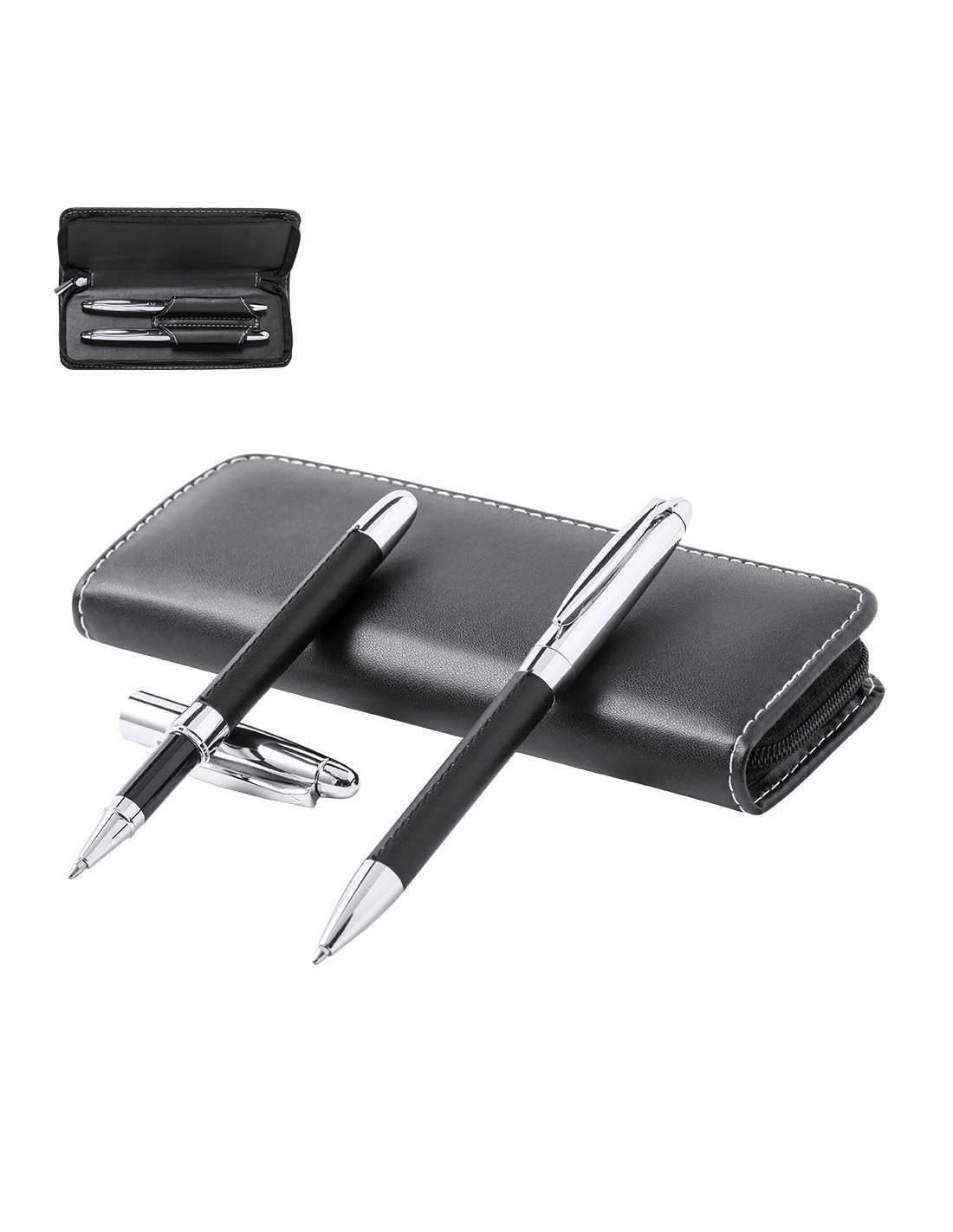 Set premium de bolígrafo y roller. Fabricado en elegante combinación de polipiel en tonos negros y metal cromado. Bolígrafo de mecanismo giratorio en tinta azul y con cartucho jumbo. Roller con capucha y tinta gel en azul, carga jumbo. Presentado en estuche individual de polipiel con cierre de cremallera e interior a juego con compartimentos individuales.