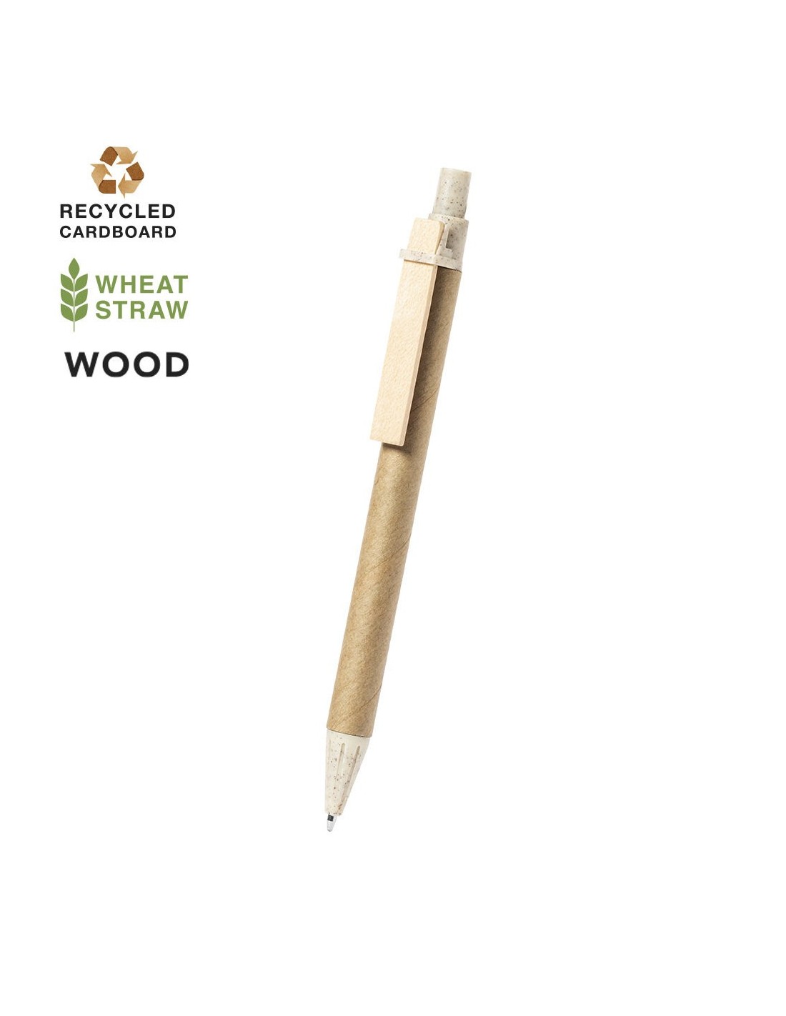 Bolígrafo de línea nature con mecanismo pulsador. Combinación de cuerpo en cartón reciclado de color natural, con punta y pulsador en caña de trigo y clip de madera, para así fomentar la utilización y reciclado de materias primas, reduciendo así las emisiones contaminantes. Tinta azul. Con distintivo Wheat Straw en la parte superior.