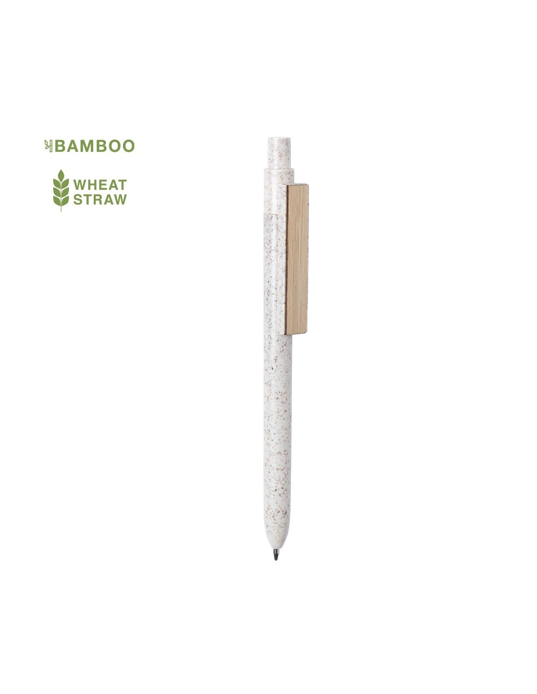 Bolígrafo de línea nature y mecanismo pulsador. Cuerpo fabricado en combinación de caña de trigo y clip en bambú, para así fomentar la utilización de materias primas naturales y reducir las emisiones contaminantes. Clip con amplia zona de marcaje y en tinta azul. Distintivo caña de trigo en la parte superior del bolígrafo.