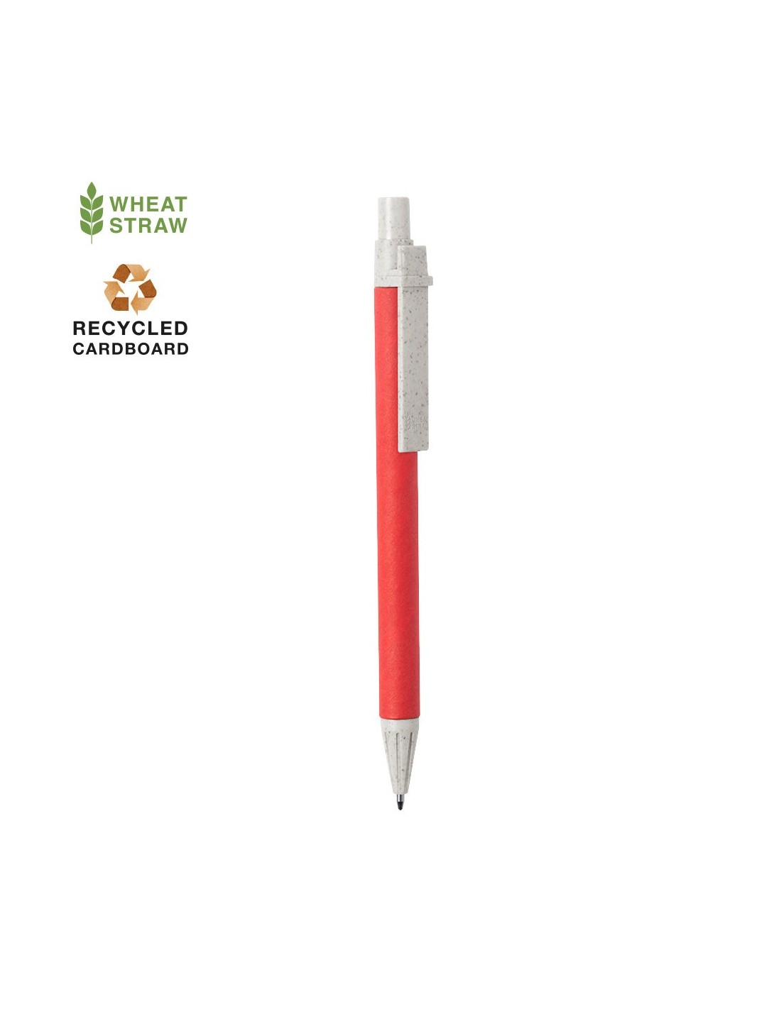 Bolígrafo con mecanismo pulsador de línea nature. Cuerpo en cartón reciclado, con accesorios en caña de trigo, para así fomentar la utilización de materias primas naturales y reducir las emisiones contaminantes. Disponible en variada gama de colores y en tinta azul.