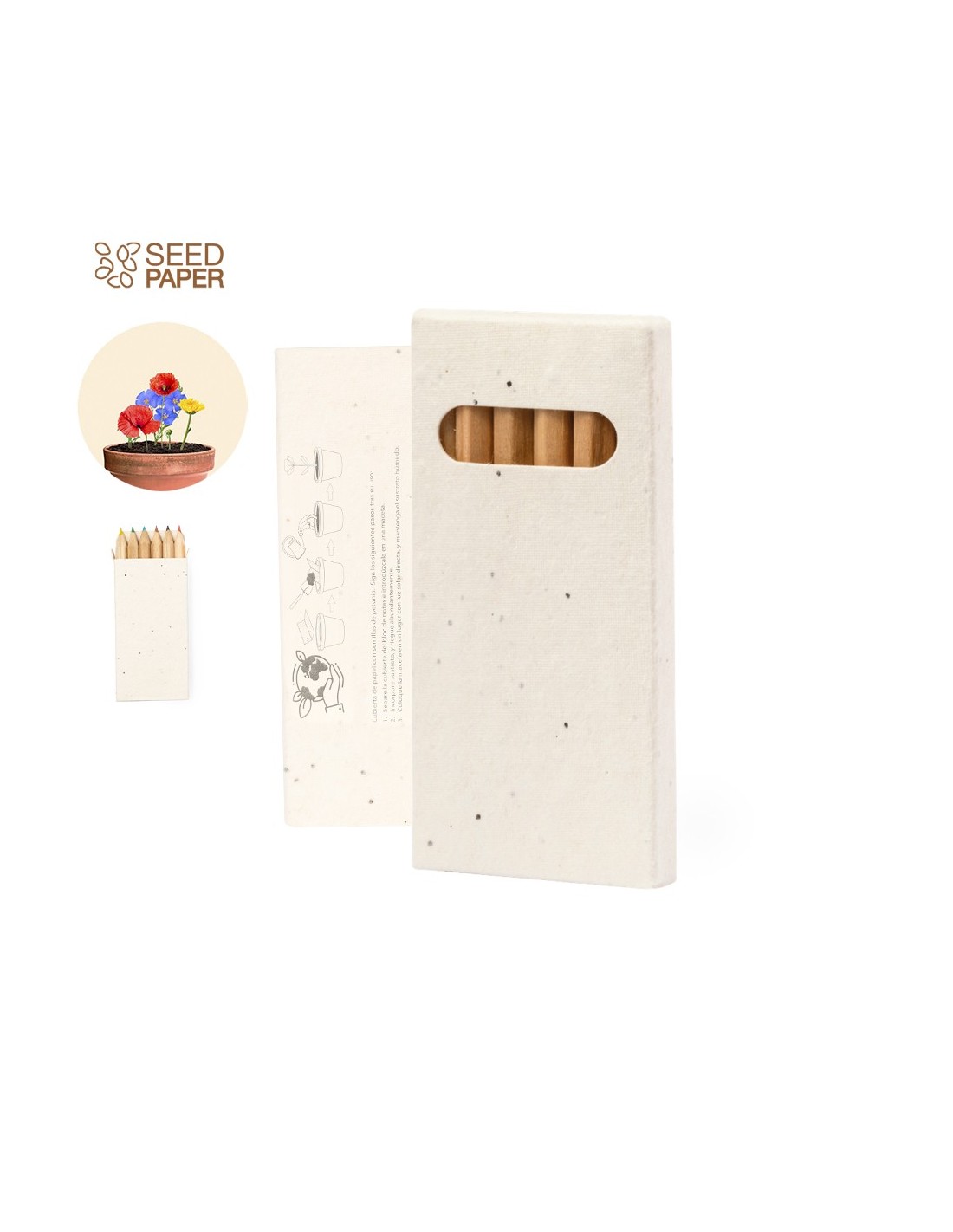 Set de 6 lápices en caja de cartón natural con semillas. Lápices de madera con cuerpo hexagonal de acabado natural y minas en variada gama de colores. Incluye semillas de petunia en la caja, convirtiéndolo así en cartón plantable al final de su vida útil. Flores en colores surtidos, con instrucciones de plantado en la cubierta trasera.