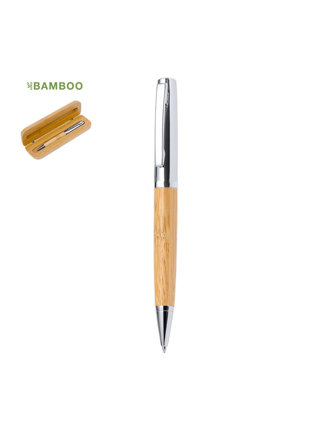 Elegante bolígrafo de bambú y metal con mecanismo giratorio. Cuerpo en resistente metal de acabado brillo y empuñadura en bambú . Clip metálico y en tinta azul. Presentado individualmente en un estuche de bambú..Materiales como el bambú fomentan la utilización de materias primas naturales, reduciendo las emisiones contaminantes. Proviene de una planta de gran resistencia y versatilidad, con crecimiento y regeneración rápidos, siendo una excelente alternativa al uso de madera tradicional.