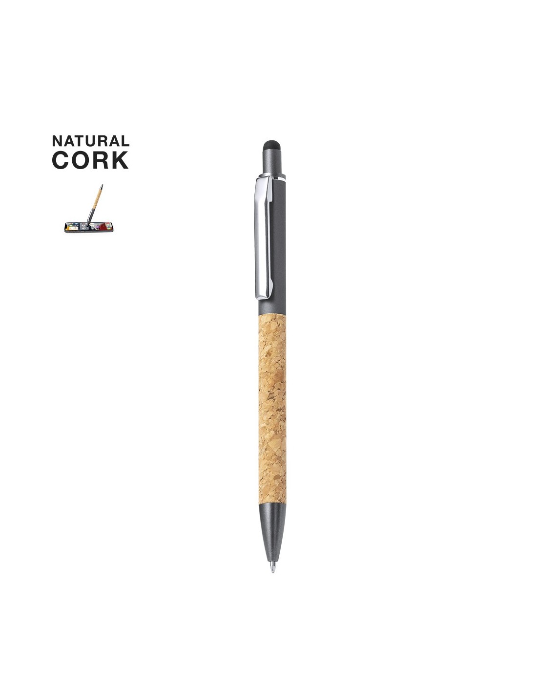 Elegante bolígrafo puntero fabricado en de corcho y aluminio con mecanismo pulsador. Cuerpo en resistente aluminio de acabado mate y empuñadura en corcho con puntero negro en la parte superior en gris. Clip metálico, con pulsador retráctil y en tinta azul. Presentado en bolsa individual reciclada..Elaborado con elementos vegetales para así fomentar la utilización de materias primas naturales y reducir las emisiones contaminantes.