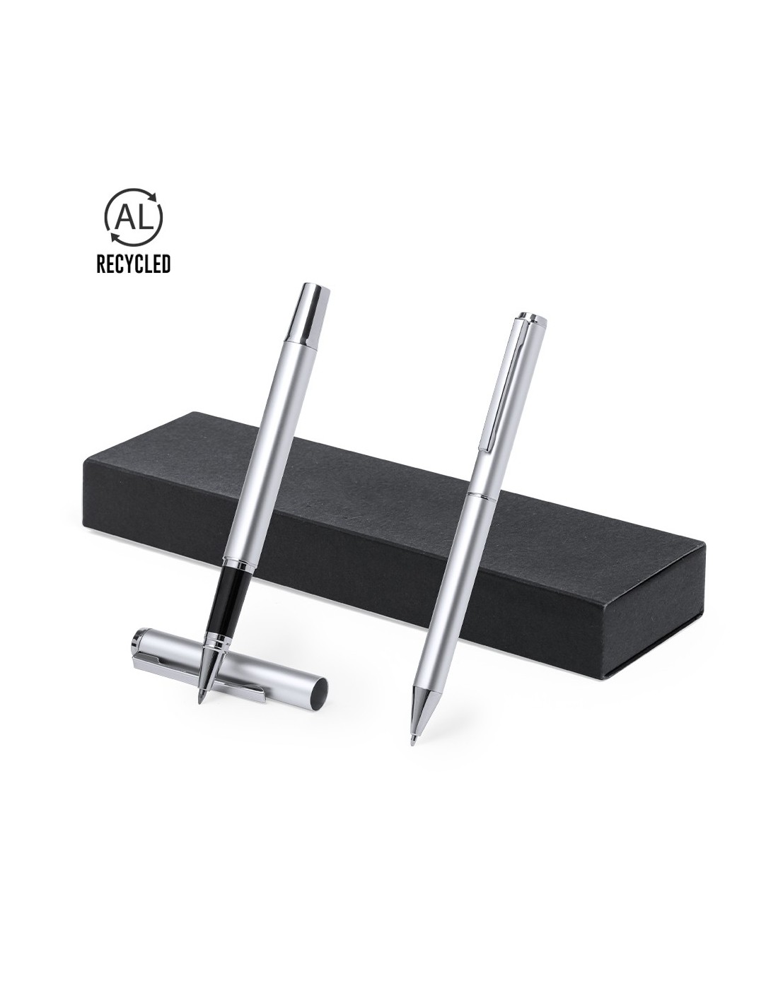 Set de bolígrafo y roller fabricados en Aluminio Reciclado. Bolígrafo de mecanismo giratorio y roller con capucha, ambos equipados con un clip metálico. Ambos cuentan con tinta azul y presentan un cuerpo de acabado brillante, con logotipo Aluminio Reciclado. Presentados en una caja individual kraft. El Aluminio Reciclado es un material con posibilidades de reciclaje casi infinitas, sin perder sus propiedades originales y consumiendo menos energía en este proceso.Certificación GRS (Global Recycled Standard / Estándar de Reciclaje Global), que garantiza el origen reciclado del material usado para fabricar el producto.