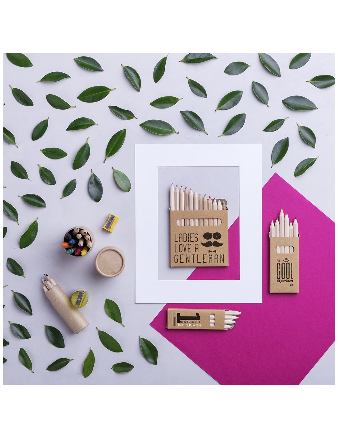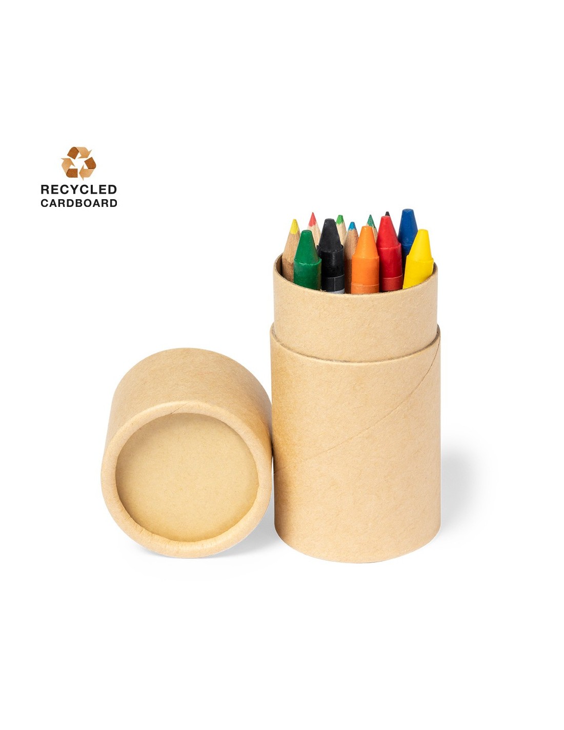 Set de 13 piezas en estuche cilíndrico de cartón natural. Incluye 6 lápices de madera con cuerpo hexagonal de acabado natural y minas en variados colores; sacapuntas en color amarillo y 6 ceras de cuerpo cilíndrico en variada gama de vivos colores.