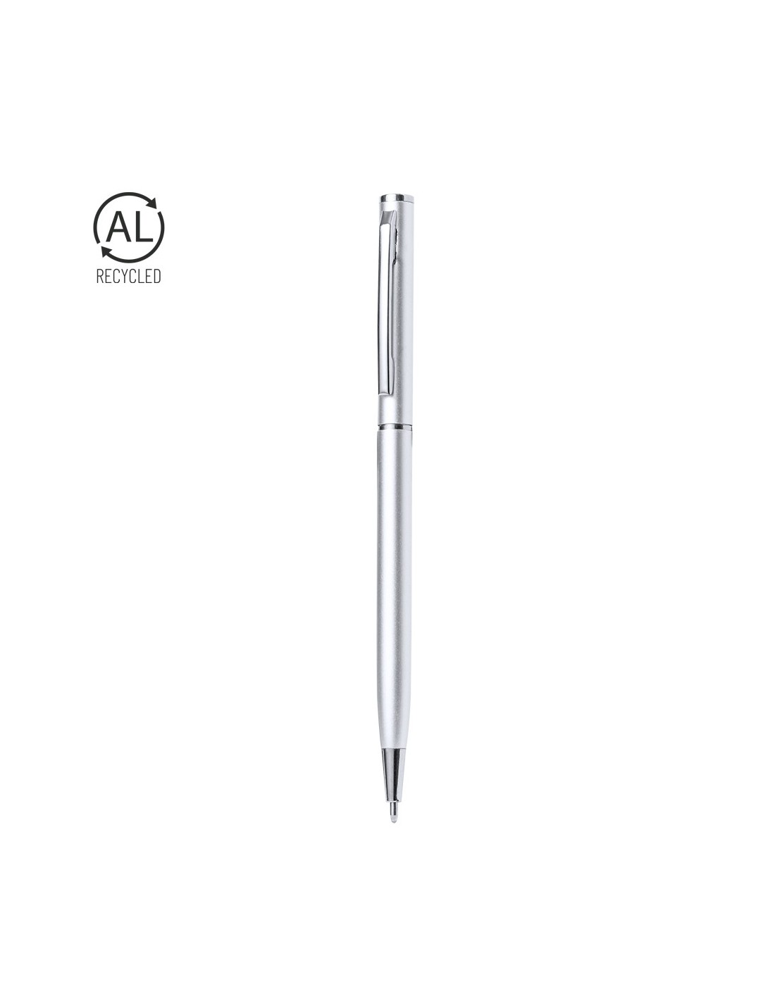 Bolígrafo con cuerpo de Aluminio Reciclado. Clip metálico y accesorios cromados. De mecanismo giratorio y de tinta azul. Con logotipo Aluminio Reciclado.El Aluminio Reciclado es un material con posibilidades de reciclaje casi infinitas, sin perder sus propiedades originales y consumiendo menos energía en este proceso.Certificación GRS (Global Recycled Standard / Estándar de Reciclaje Global), que garantiza el origen reciclado del material usado para fabricar el producto.