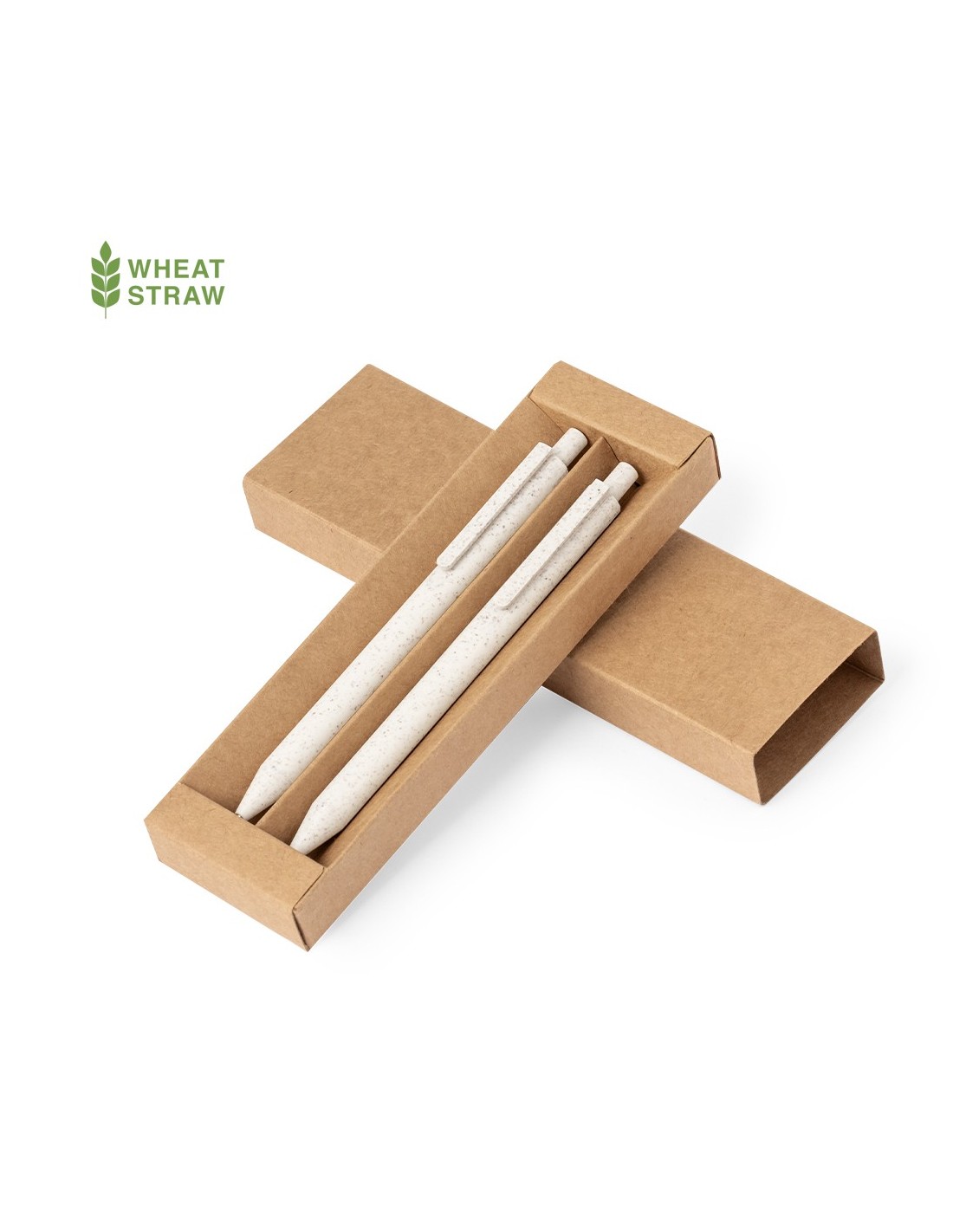 Set de bolígrafo y portaminas. Fabricados en caña de trigo con clip. Bolígrafo en tinta azul y portaminas con 2 minas incluidas de 0,7mm. Presentado en estuche individual de cartón reciclado. Logotipo Wheat Straw en la parte superior del bolígrafo y portaminas.La caña de trigo fomenta la utilización de materias primas naturales, reduciendo así las emisiones contaminantes.