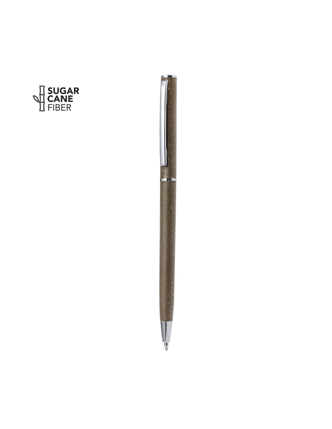Bolígrafo con cuerpo en caña de azúcar. Clip metálico y accesorios cromados. De mecanismo giratorio y de tinta azul. Con logotipo caña de azúcar y disponible en color natural..La fibra caña de azúcar es un material natural con origen en materiales biodegradables que proceden del residuo vegetal fibroso resultante tras la extracción del jugo de la caña de azúcar. Se trata de un material resistente, con estilo sostenible y respetuoso con el medio ambiente.