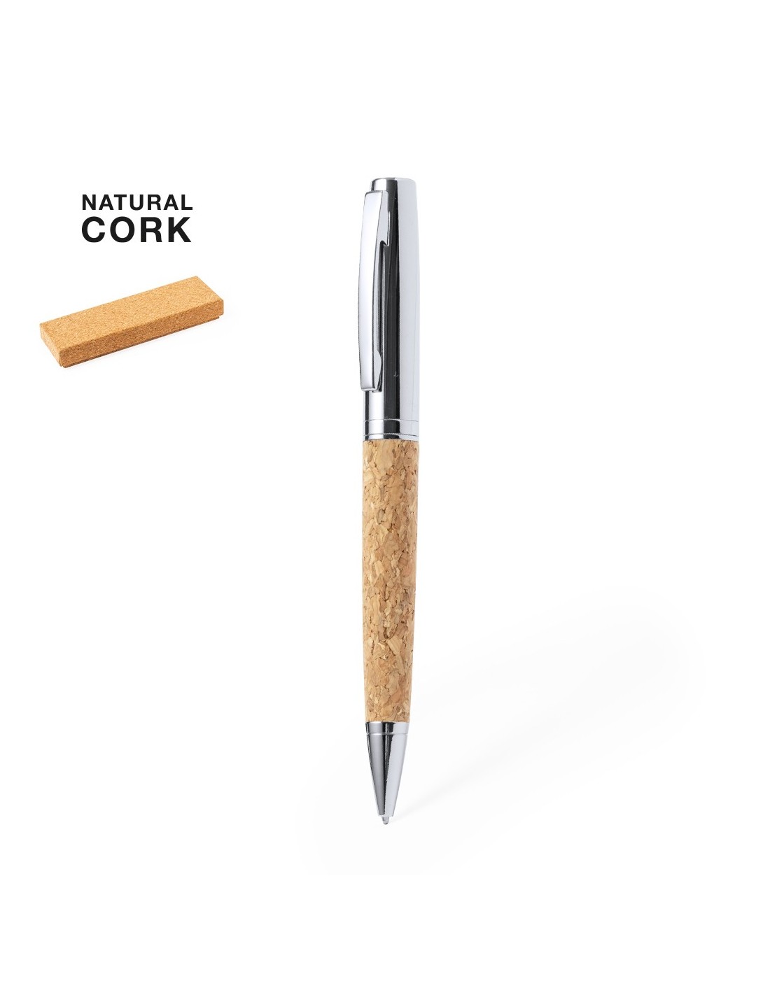 Elegante bolígrafo de corcho y metal con mecanismo giratorio. Cuerpo en resistente metal de acabado brillo y empuñadura en corcho. Clip metálico y en tinta azul. Presentado individualmente en un estuche de corcho..Elaborado con elementos vegetales para así fomentar la utilización de materias primas naturales y reducir las emisiones contaminantes.