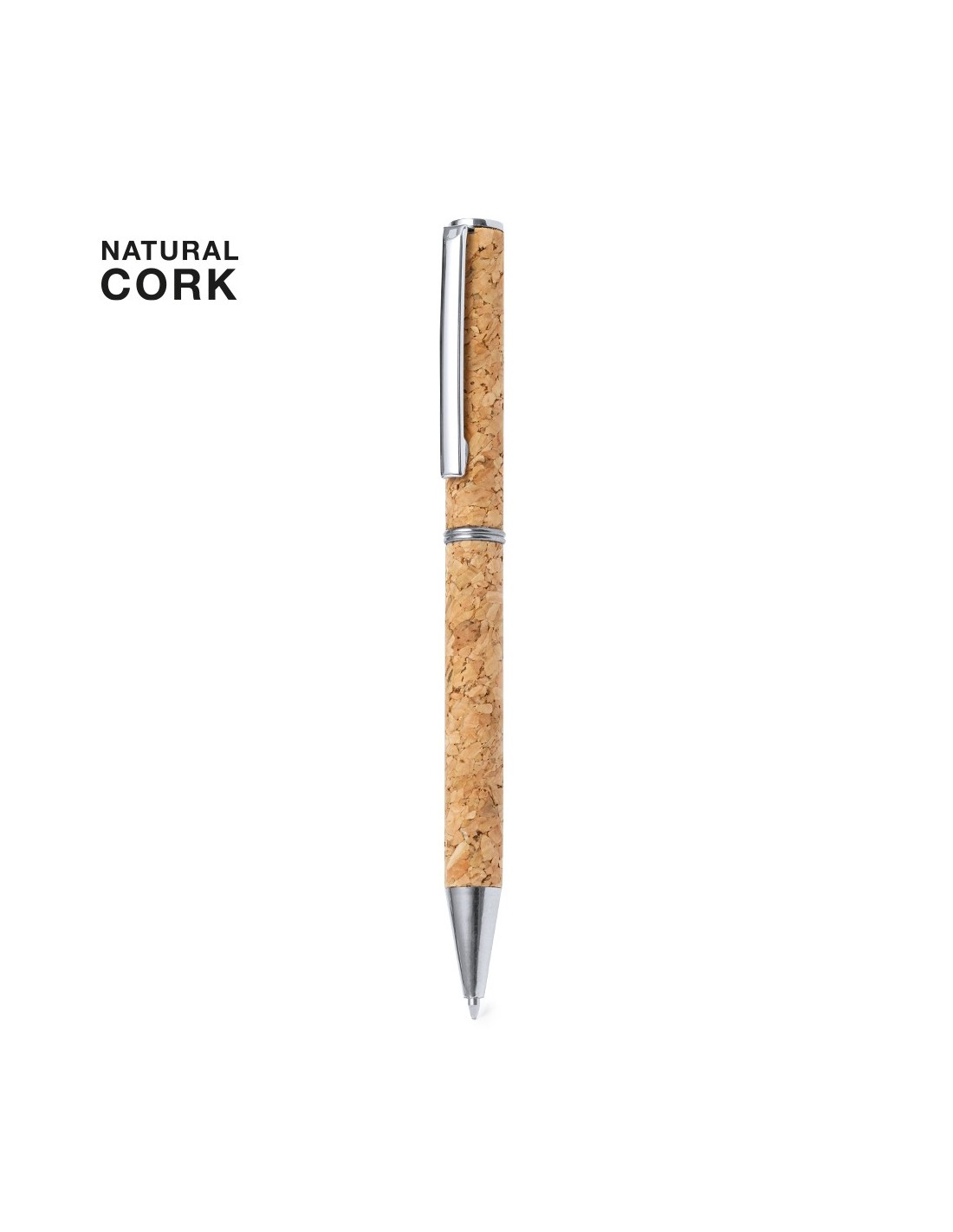 Bolígrafo con cuerpo en corcho natural. Clip metálico y accesorios cromados. De mecanismo giratorio y de tinta azul..Elaborado con elementos vegetales para así fomentar la utilización de materias primas naturales y reducir las emisiones contaminantes.