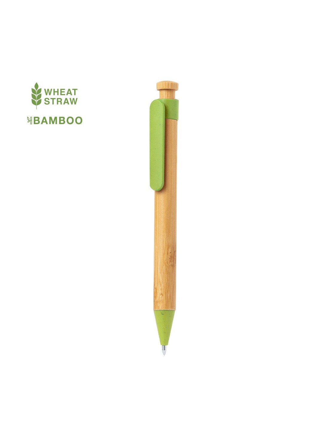 Bolígrafo con mecanismo pulsador de bambú y caña de trigo. Cuerpo en bambú, con accesorios a juego en caña de trigo. Original clip tamaño XL, disponible en variada gama de colores de carga jumbo y en tinta azul.Materiales como el bambú fomentan la utilización de materias primas naturales, reduciendo las emisiones contaminantes. Proviene de una planta de gran resistencia y versatilidad, con crecimiento y regeneración rápidos, siendo una excelente alternativa al uso de madera tradicional.