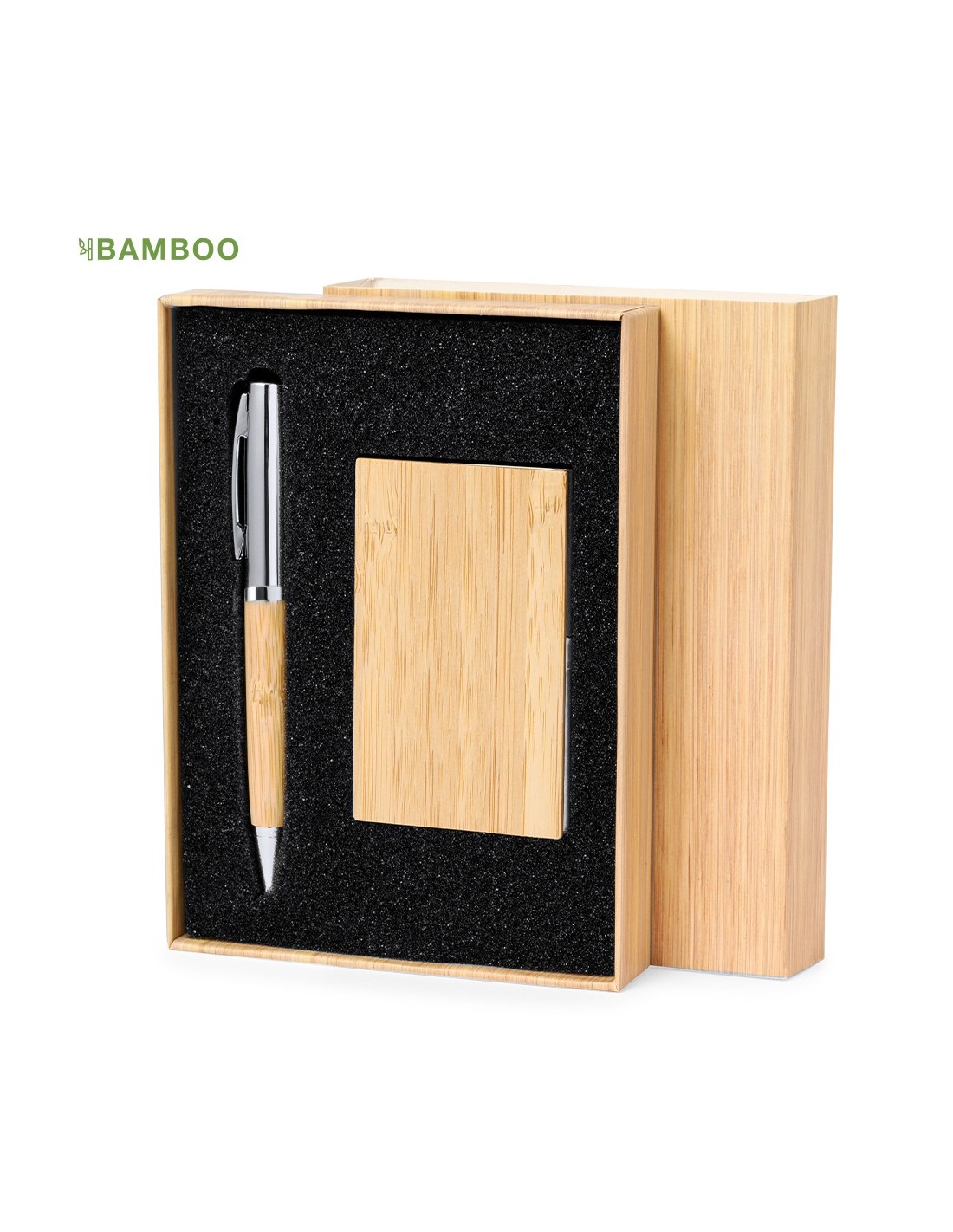Distinguido set de bolígrafo y tarjetero fabricados en bambú y metal. Práctico conjunto de bolígrafo con cuerpo metálico brillante y empuñadura de suave bambú con mecanismo giratorio y en tinta azul. Incluye excelente tarjetero de un compartimento en brillante metal, con tapa en suave bambú. Presentado en una caja individual diseño bambú.Materiales como el bambú fomentan la utilización de materias primas naturales, reduciendo las emisiones contaminantes. Proviene de una planta de gran resistencia y versatilidad, con crecimiento y regeneración rápidos, siendo una excelente alternativa al uso de madera tradicional.