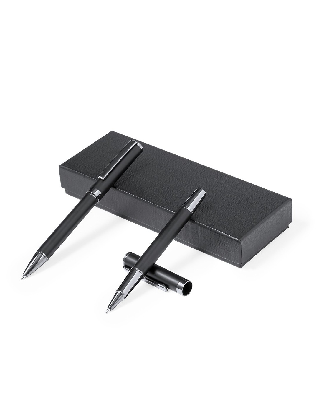 Elegante set de bolígrafo y roller. Bolígrafo de mecanismo giratorio y roller con capucha, ambos provistos de un clip metálico. Con tinta azul, su cuerpo presenta un elegante acabado negro mate y sutiles detalles cromados. Presentados en un estuche kraft negro, con interior troquelado en tacto de terciopelo.