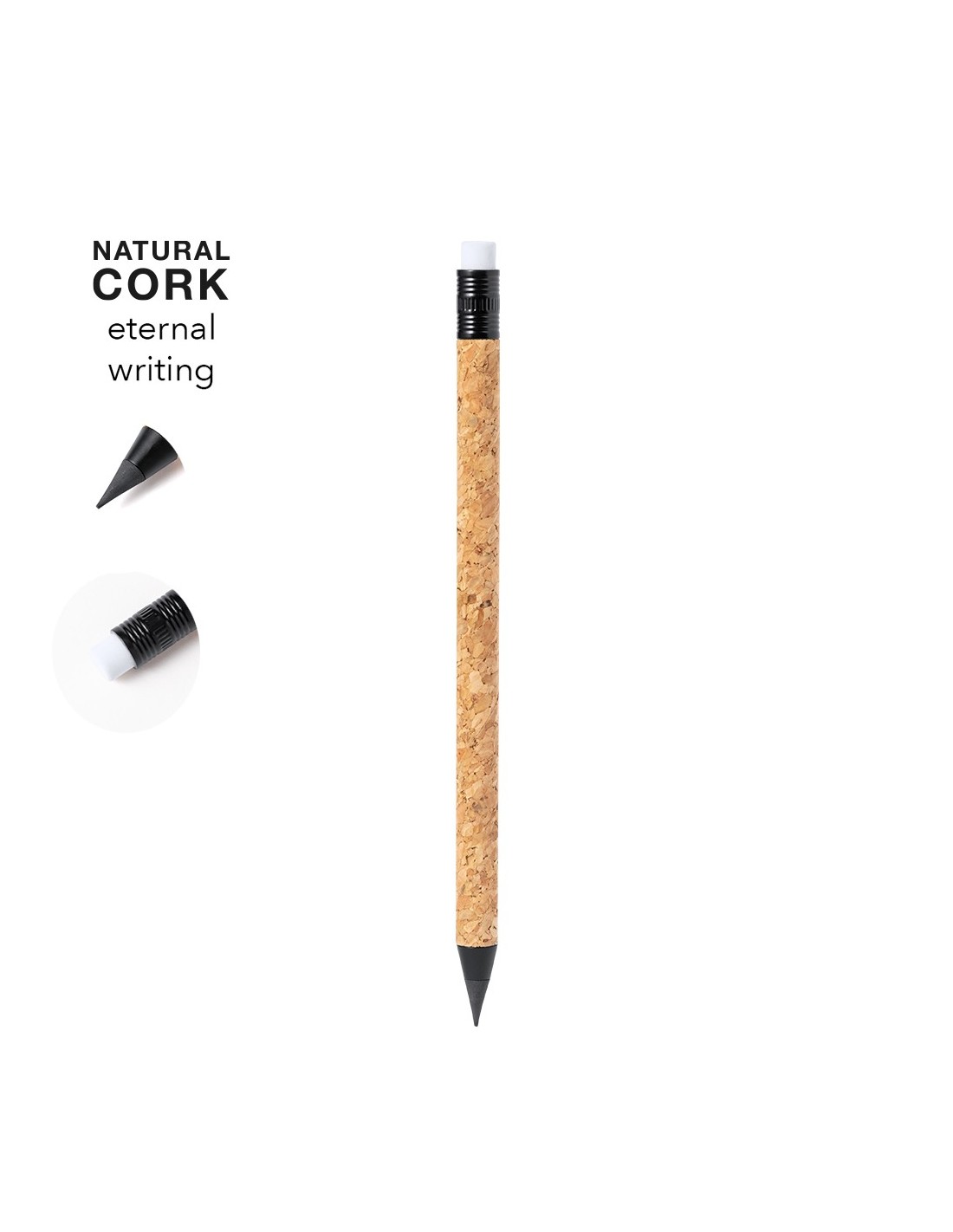 Lápiz eterno fabricado en corcho. Reutilizable y con escritura infinita, para usar siempre el mismo lápiz y no generar residuos. Incluye goma de borrar en la parte superior del lápiz. Elaborado con elementos vegetales para así fomentar la utilización de materias primas naturales y reducir las emisiones contaminantes.