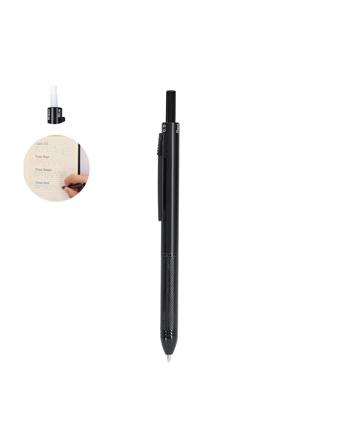 Bolígrafo portaminas 4 en 1, con ingenioso mecanismo de uso. La posición del pulsador permite seleccionar el color de la tinta o la función portaminas. Fabricado en resistente aluminio. Opciónes de tinta azul, negra y roja. Cuenta función portaminas. Incluida 1 mina de 0,5mm. Con goma integrada en el pulsador. Con empuñadura ergonómica y clip a juego.