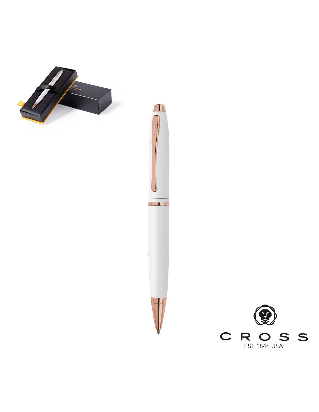Bolígrafo Cross con mecanismo retráctil, de distinguido diseño bicolor blanco con elegantes toques de oro rosa. Cuerpo metálico en suave acabado y original clip con logotipo. Presentado en elegante estuche individual en color negro, con logotipo de la marca e interior en suave antelina a juego. En tinta negra.