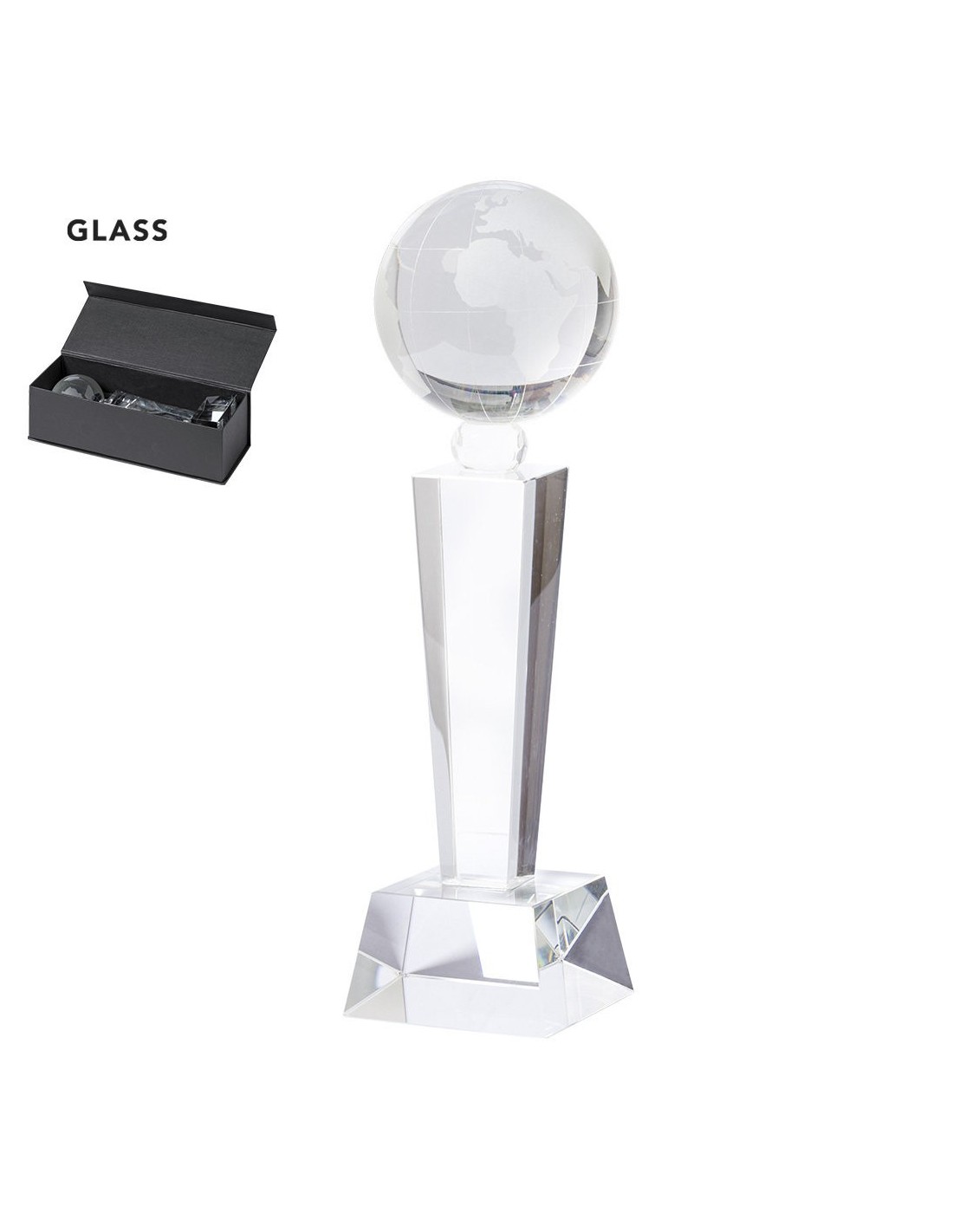 Trofeo de grueso cristal con diseño mundo y resistente base. Especialmente diseñado para marcaje a láser y presentado en estuche de protección en resistente cartón y cierre magnético, con interior troquelado en espuma.