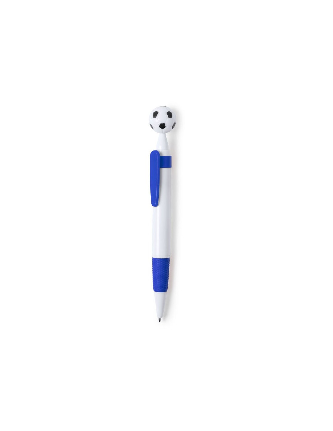 Bolígrafo para los más futboleros con detalle en forma de balón. De mecanismo pulsador y en desenfadado diseño bicolor. Con cuerpo en color blanco, con clip y empuñadura a juego, en variada gama de colores. Amplia superficie de impresión y en tinta azul.