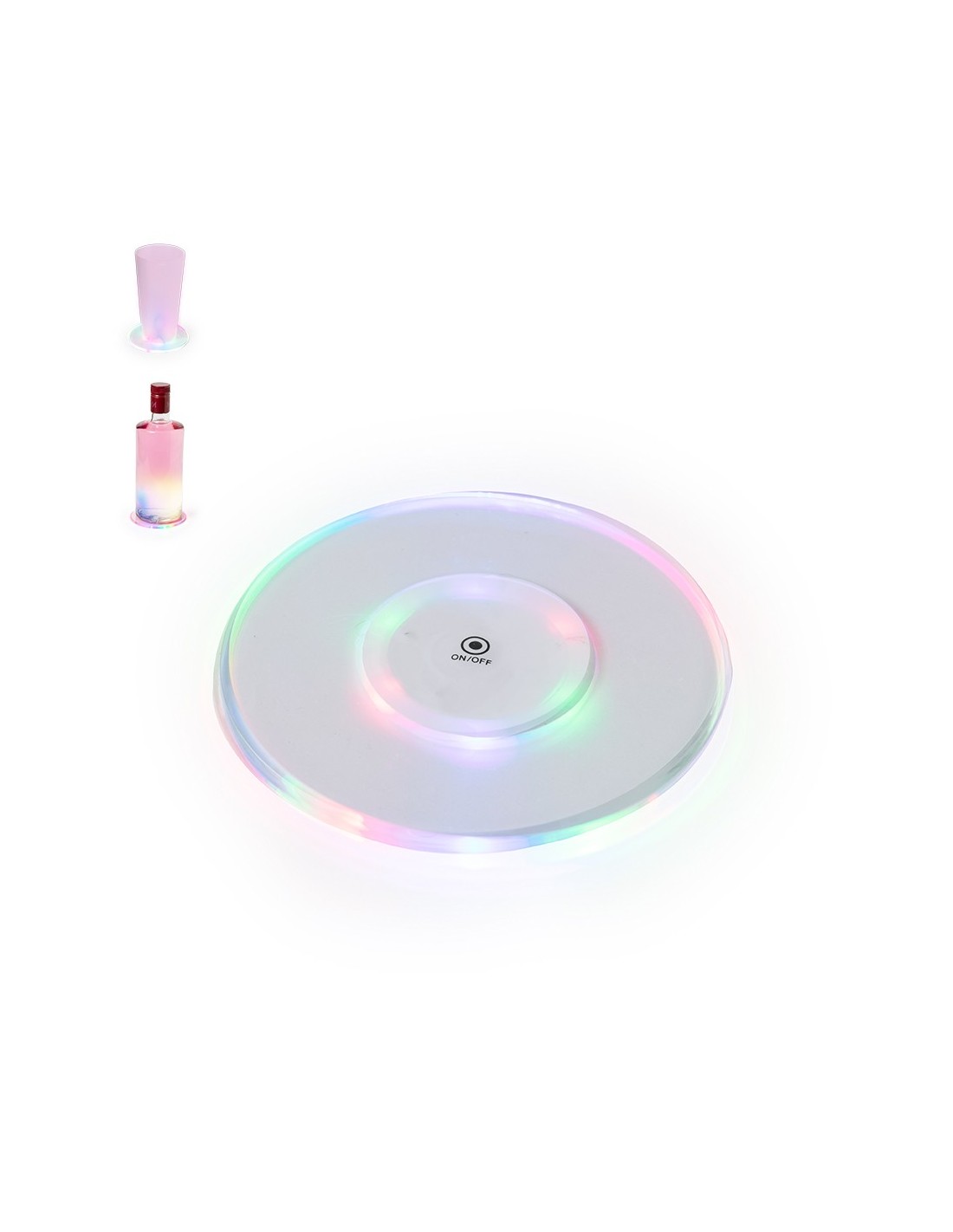 Original posavasos con 6 LEDs para iluminar las bebidas. Con botón en la base y 3 posiciones de iluminación (luz fija y luz intermitente rápida o lenta) . Se fija a la base de cualquier bebida con cinta autoadhesiva y está alimentado por dos pilas de botón (incluidas).