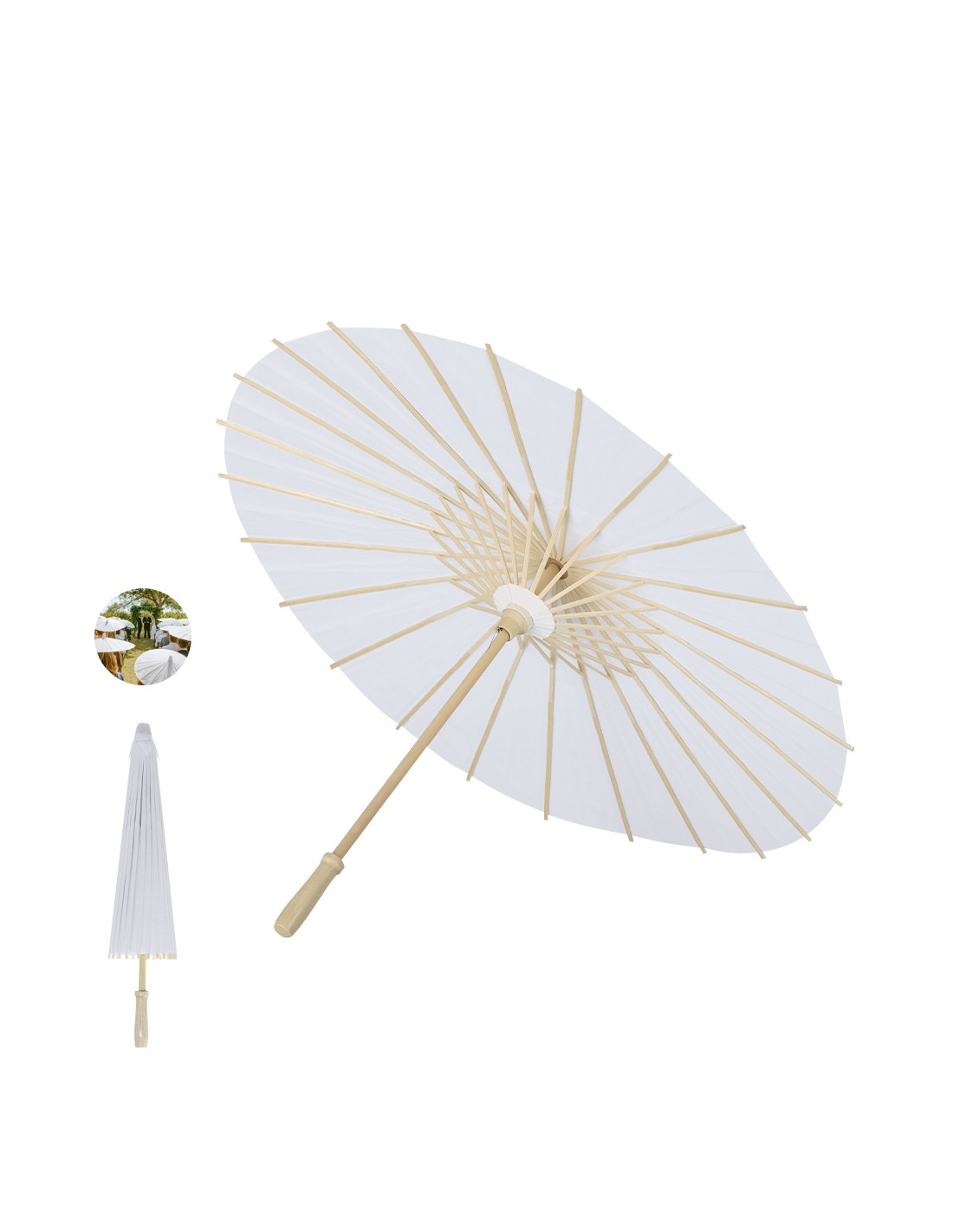 Original sombrilla de madera y tela en papel. Con mango en madera natural en acabado brillante. Sistema de apertura y cierre manual, con diámetro de 58 cm las varillas están fabricadas en madera. Ideal para eventos al aire libre.Elaborado con elementos vegetales para así fomentar la utilización de materias primas naturales y reducir las emisiones contaminantes.