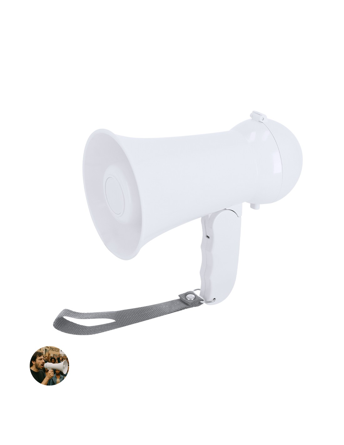 Megáfono plegable en ABS en color sólido con acabado brillante. Incluye botones de control en el extremo, sirena, grabadora, ON/OFF y control de volumen. Asa plegable con correa fija en color gris unida mediante anilla metálica. Funciona con 4 pilas AA (no incluidas).