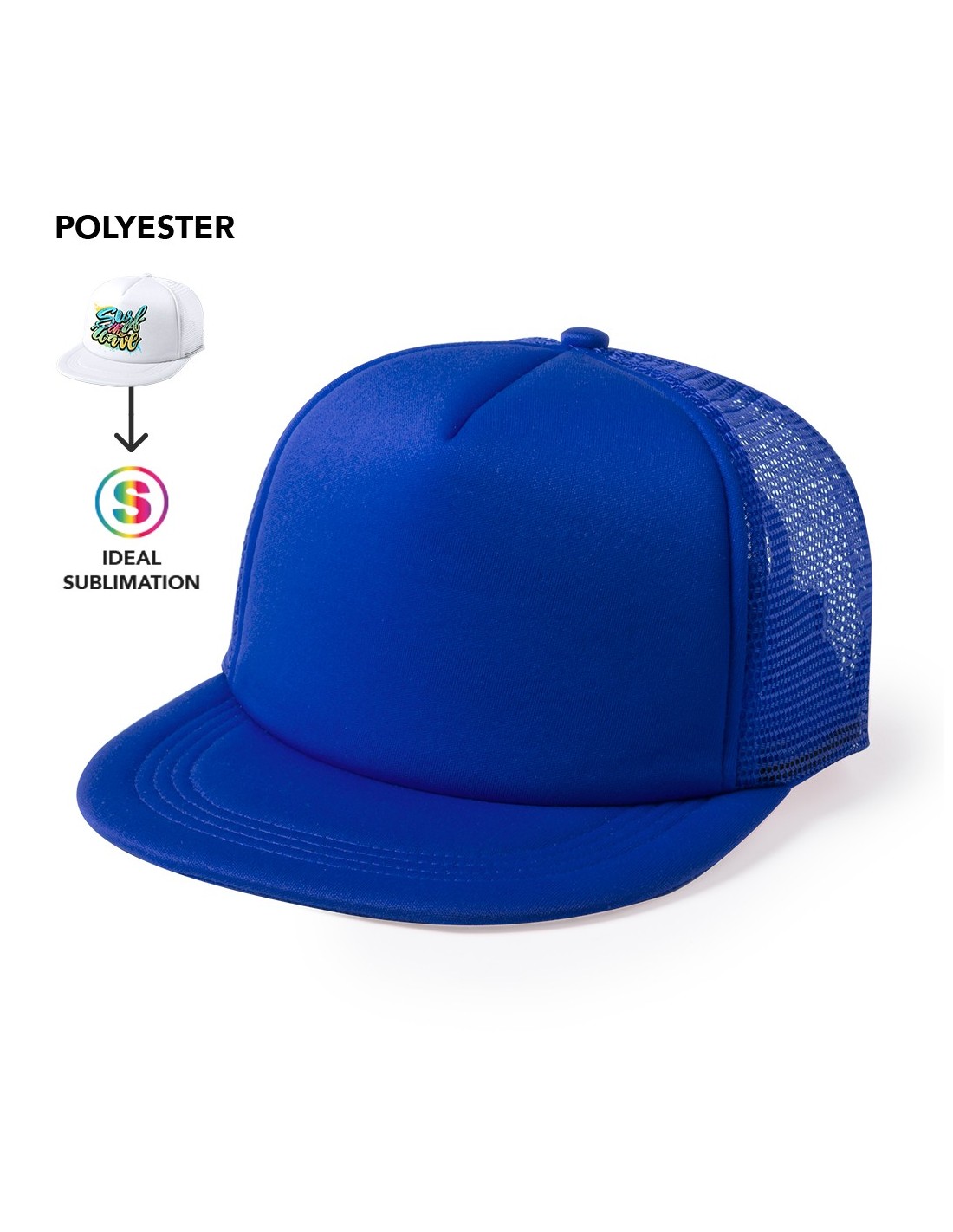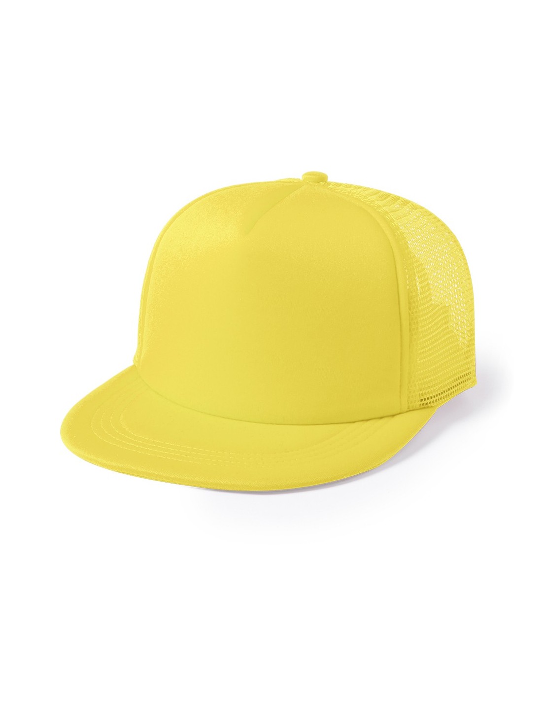 Gorra de 5 paneles con visera plana acolchada y parte trasera en redecilla a juego. Material 100% poliéster de suave acabado con cierre ajustable de velcro y en variada gama de vivos colores.