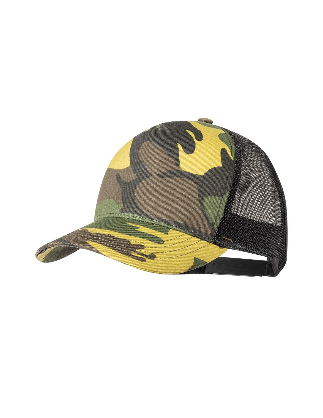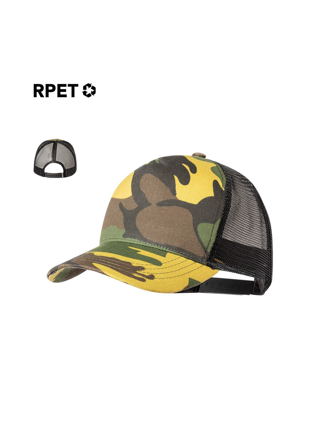 Gorra de 5 paneles en poliéster RPET con rejilla y cierre ajustable de plástico con diseño de camuflaje o verde militar. Etiqueta distintiva de RPET. .El material RPET se elabora a partir de plástico reciclado, para así fomentar la reutilización de residuos plásticos y ayudar a la sostenibilidad del planeta.