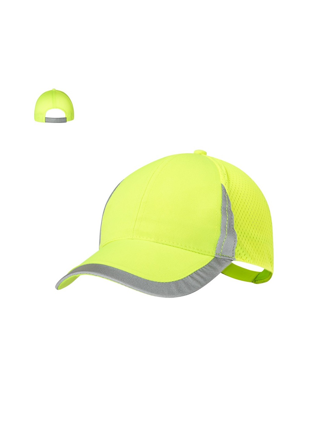 Gorra deportiva de 6 paneles en suave poliéster. Cierre ajustable con velcro y parte trasera con redecilla transpirable. En color amarillo flúor con detalles reflectantes en visera, parte frontal y cierre.