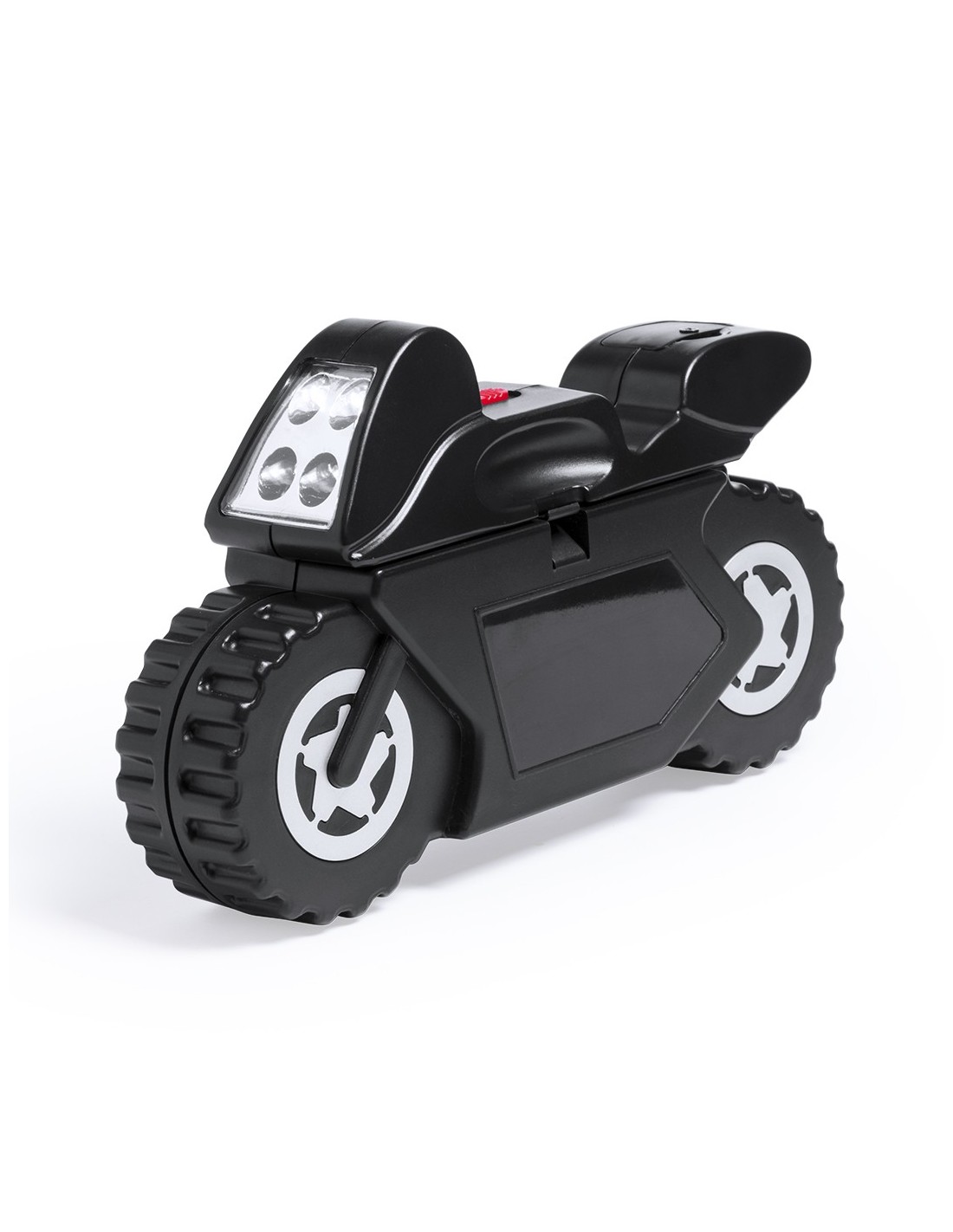 Set de herramientas de 14 accesorios en resistente estuche con diseño de moto, con linterna de 4 ledes integrada. Incluye set de destornilladores de precisión, herramienta de fijación, cabezales destornilladores planos y de estrella y llaves para tuercas