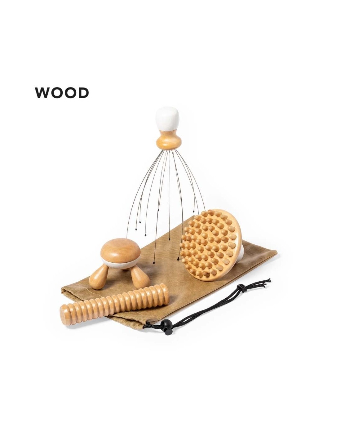 Set de masaje fabricado en madera natural. Contenido: Masajeador con mango en madera natural y patas metálicas, con suaves terminaciones de goma y efecto más que relajante. Masajeador cilindro para pies. Masajeador para espalda con 3 patas. Masajeador con multitud de puntos de masaje. Bolsa a juego, con cierre de cordón y bola de ajuste. Presentación en caja individual de diseño kraft.