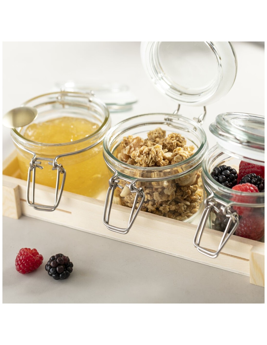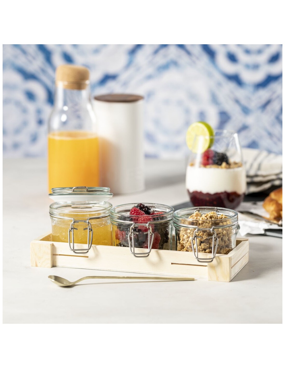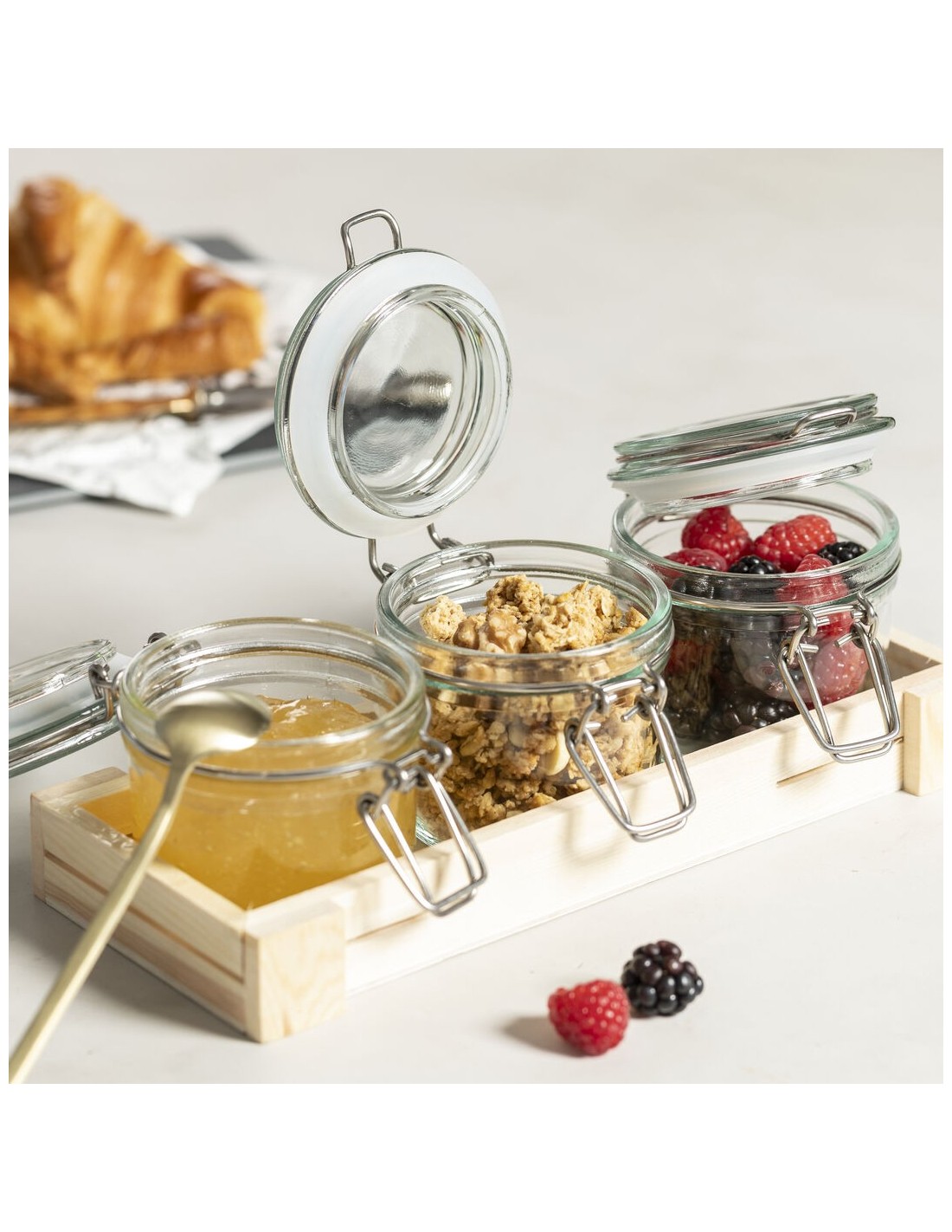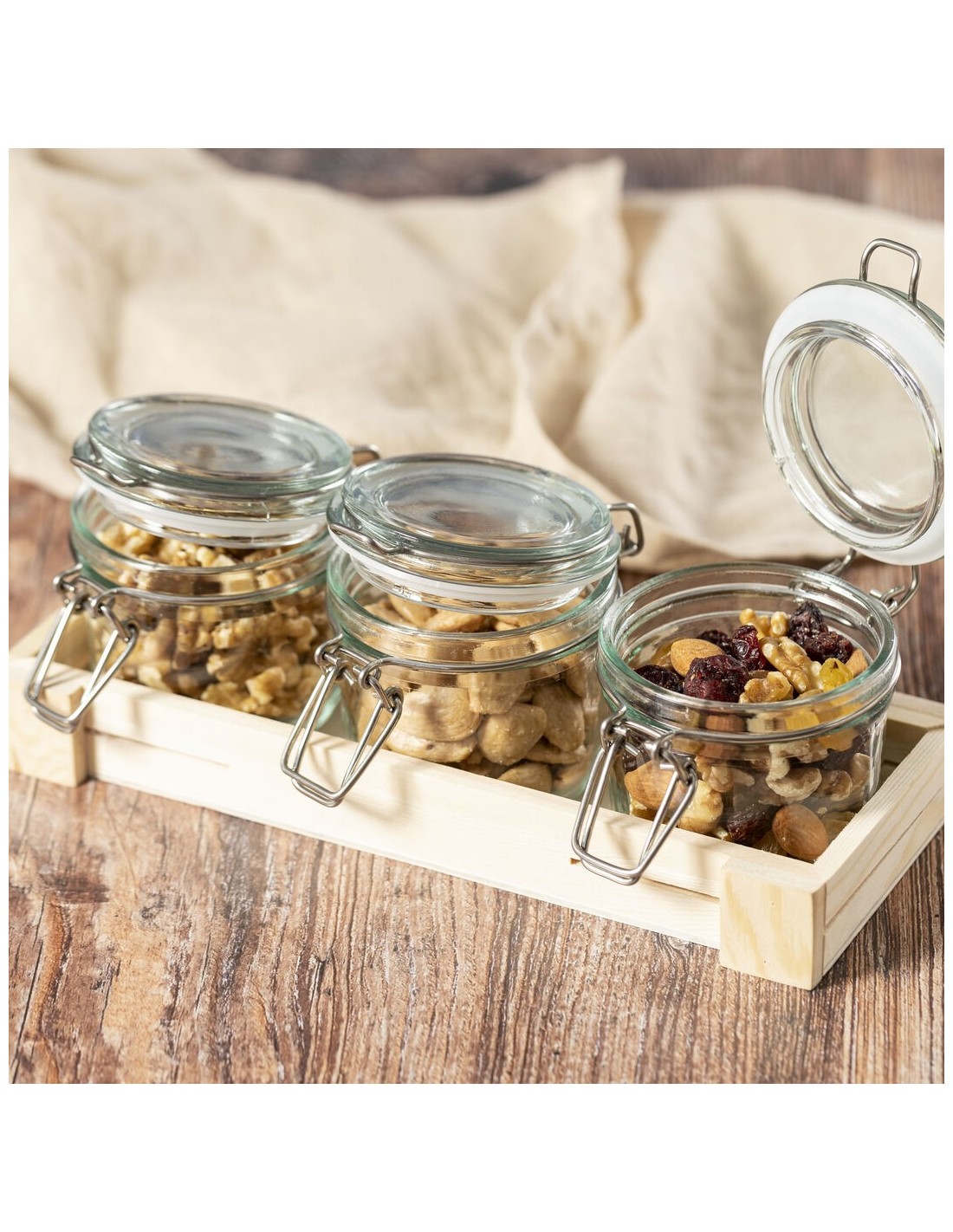 Set de 3 Tarros de Cristal con 230 ml de capacidad. Complementos versátiles para organizar tu casa, cocina, despensa… según tus gustos y necesidades. Fabricados en cristal, y con cierres a presión de acero inoxidable, una combinación de materiales que ofrecen gran resistencia y durabilidad. Presentados en bandeja de madera y en caja individual de diseño eco.