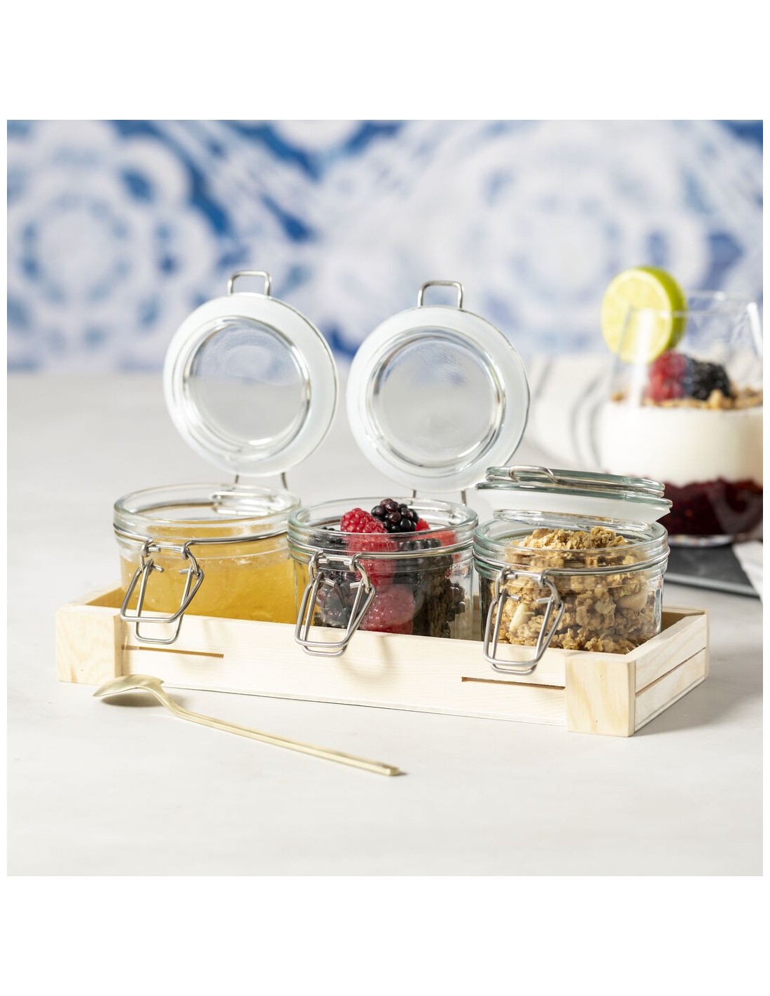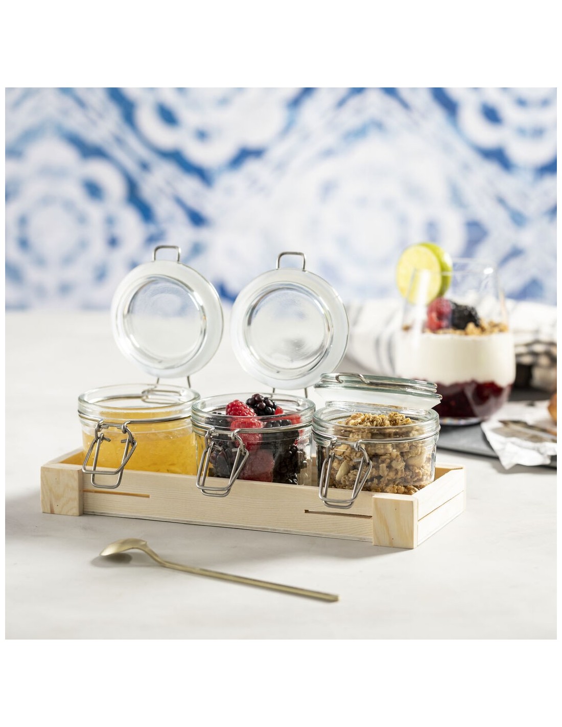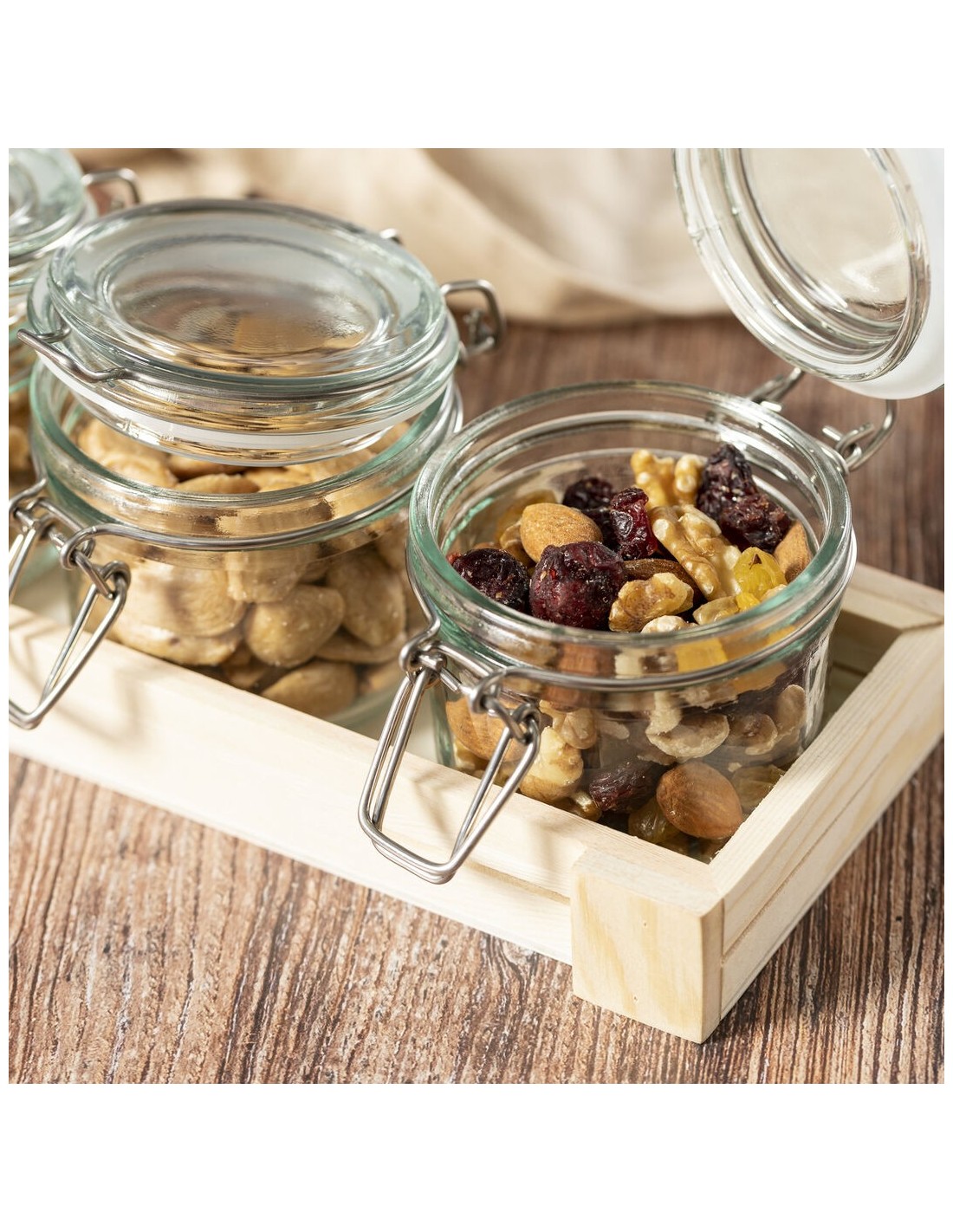 Set de 3 Tarros de Cristal con 230 ml de capacidad. Complementos versátiles para organizar tu casa, cocina, despensa… según tus gustos y necesidades. Fabricados en cristal, y con cierres a presión de acero inoxidable, una combinación de materiales que ofrecen gran resistencia y durabilidad. Presentados en bandeja de madera y en caja individual de diseño eco.