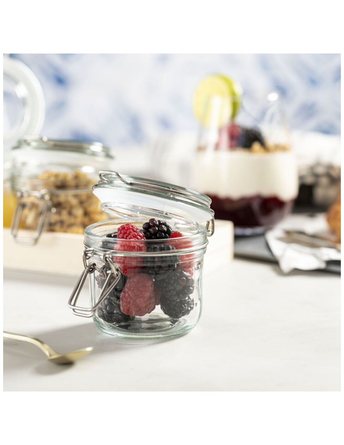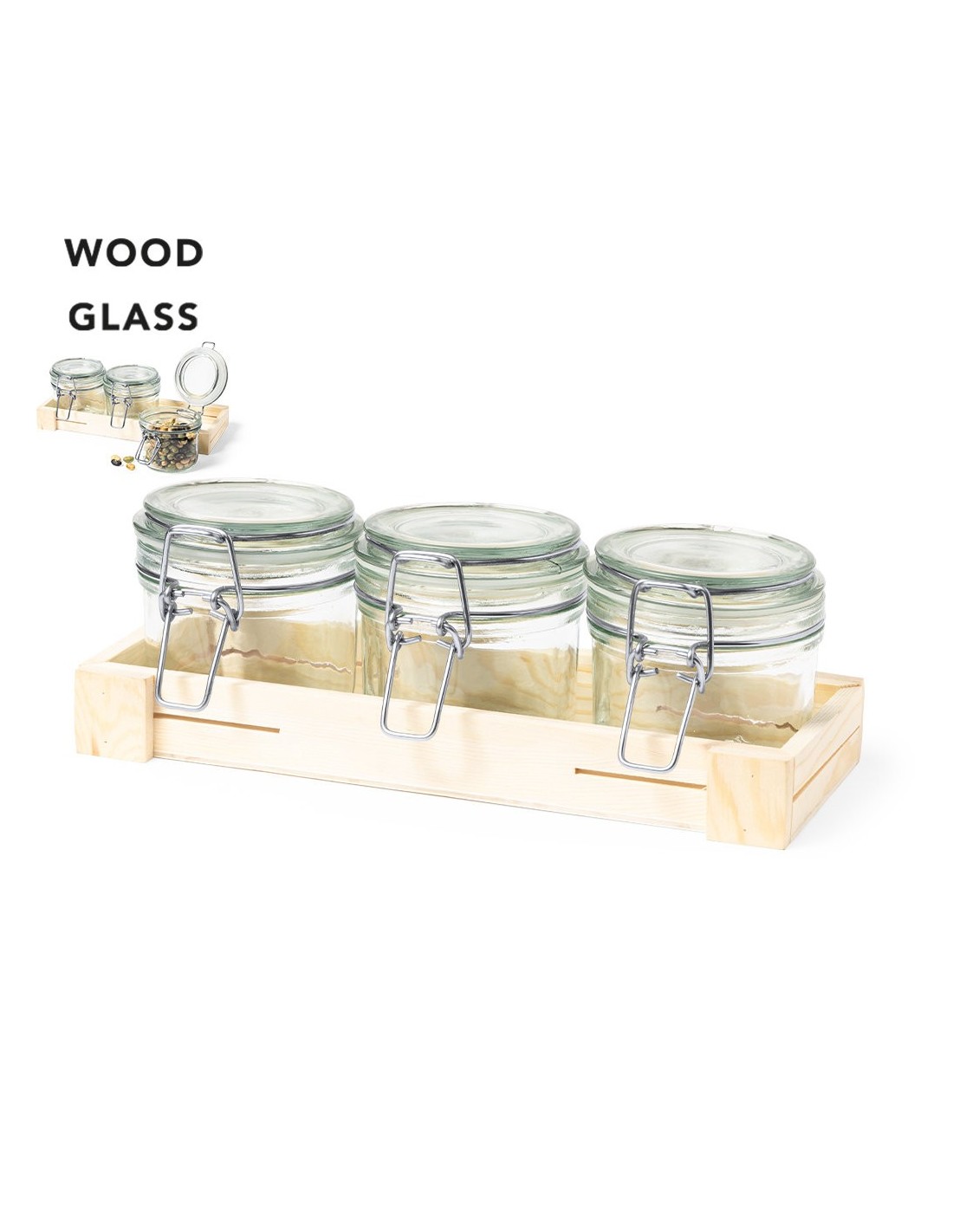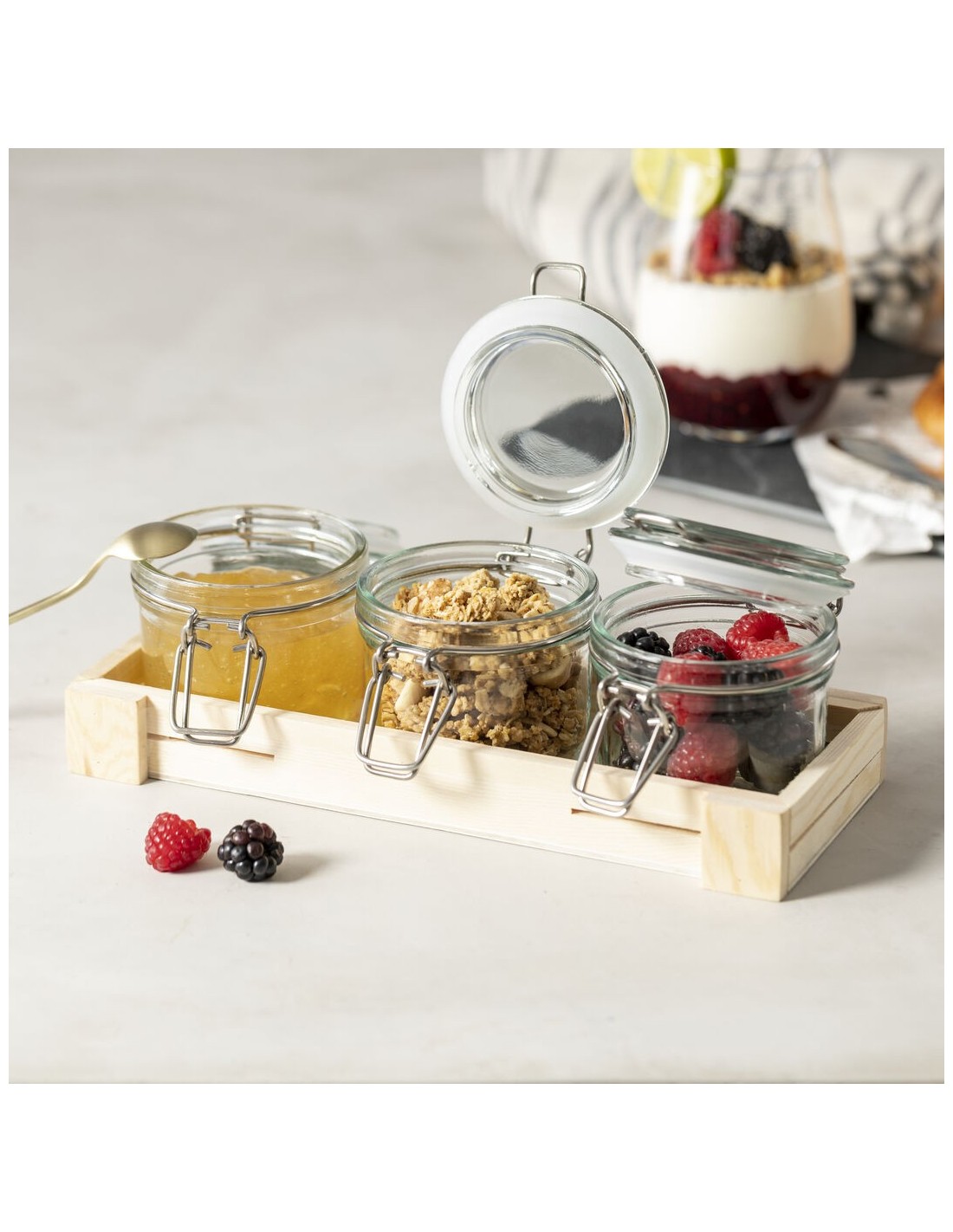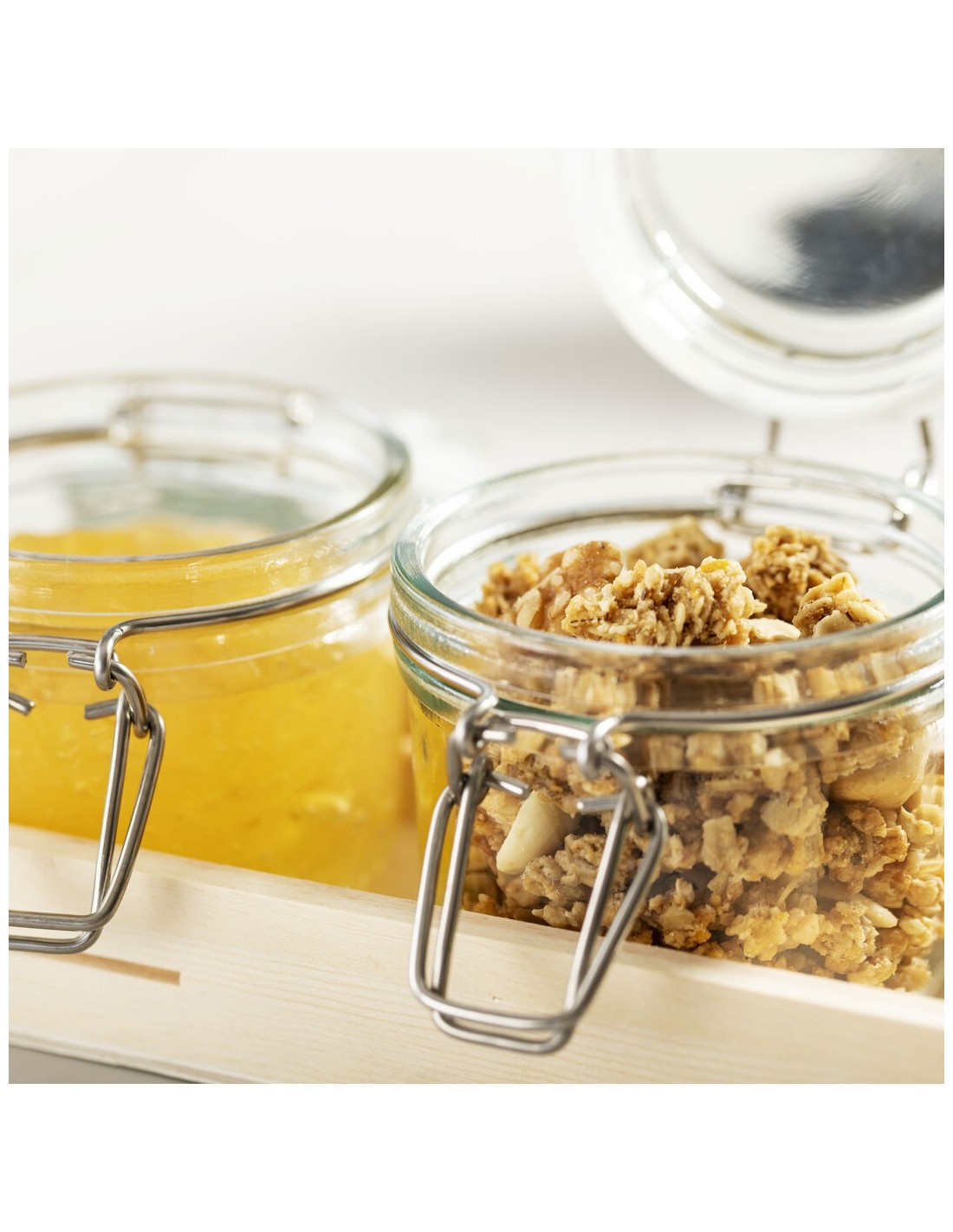 Set de 3 Tarros de Cristal con 230 ml de capacidad. Complementos versátiles para organizar tu casa, cocina, despensa… según tus gustos y necesidades. Fabricados en cristal, y con cierres a presión de acero inoxidable, una combinación de materiales que ofrecen gran resistencia y durabilidad. Presentados en bandeja de madera y en caja individual de diseño eco.