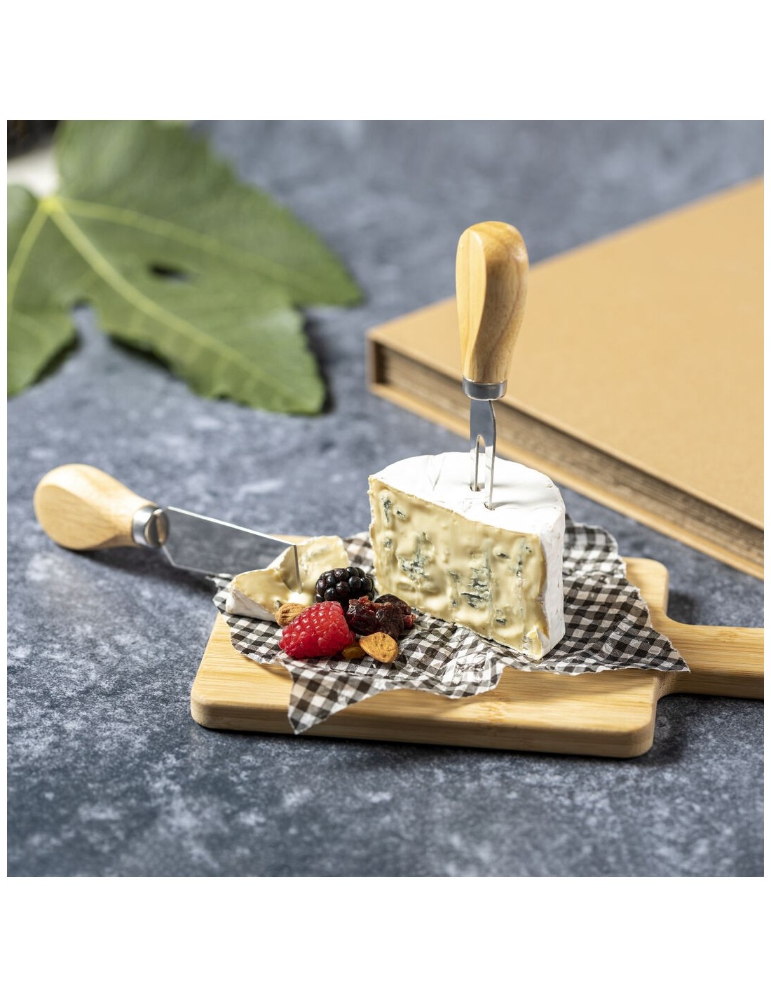 Completo set de quesos de línea nature, fabricado en bambú y acero inoxidable. Incluye tabla de corte y presentación con mango y agujero para colgar, trinchador y cuchillo. Presentado en estuche individual troquelado de cartón reciclado acabado kraft.